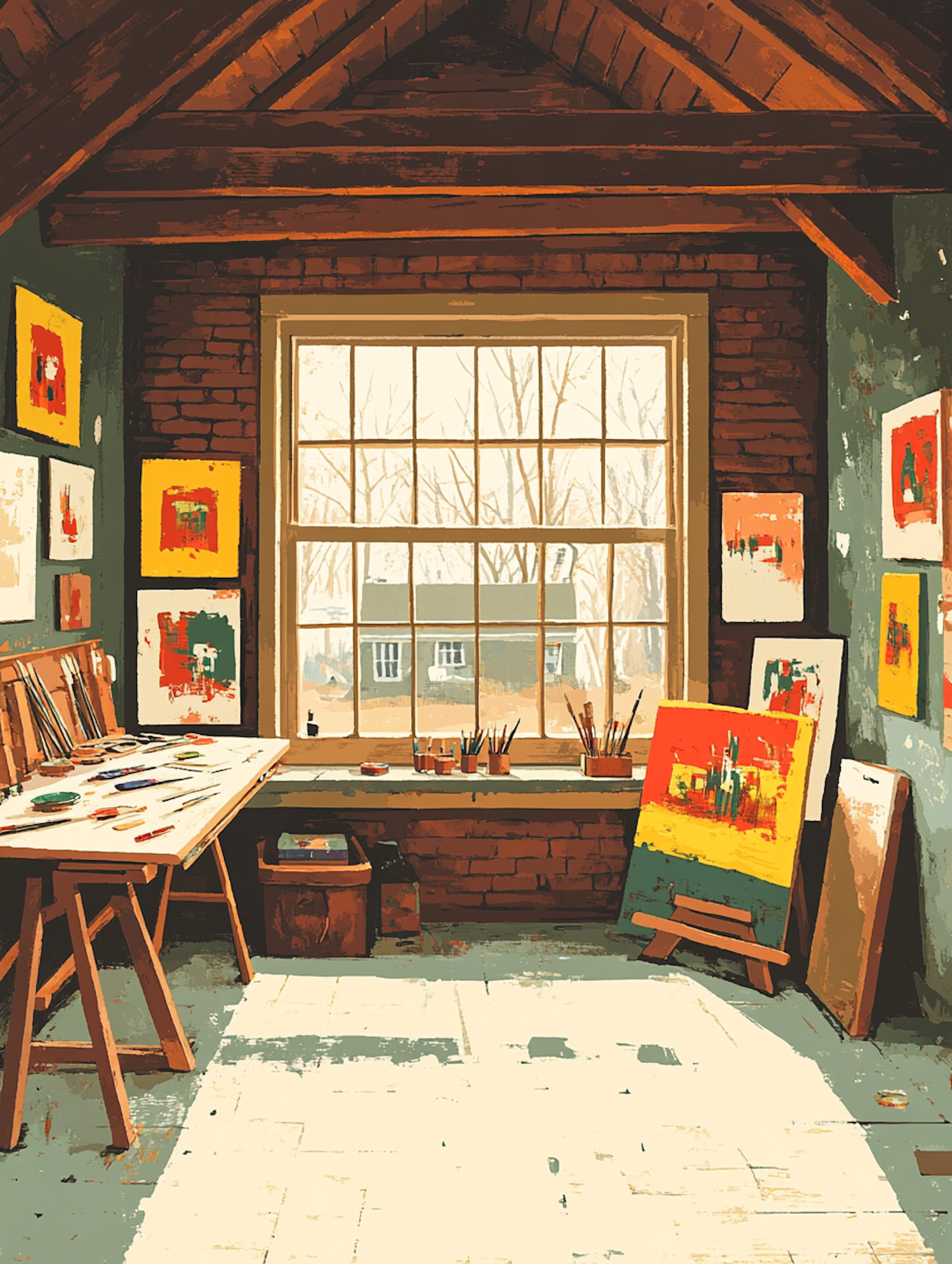 Cozy artist's studio with rustic charm, featuring abstract paintings, art supplies, and a large window with a winter view.