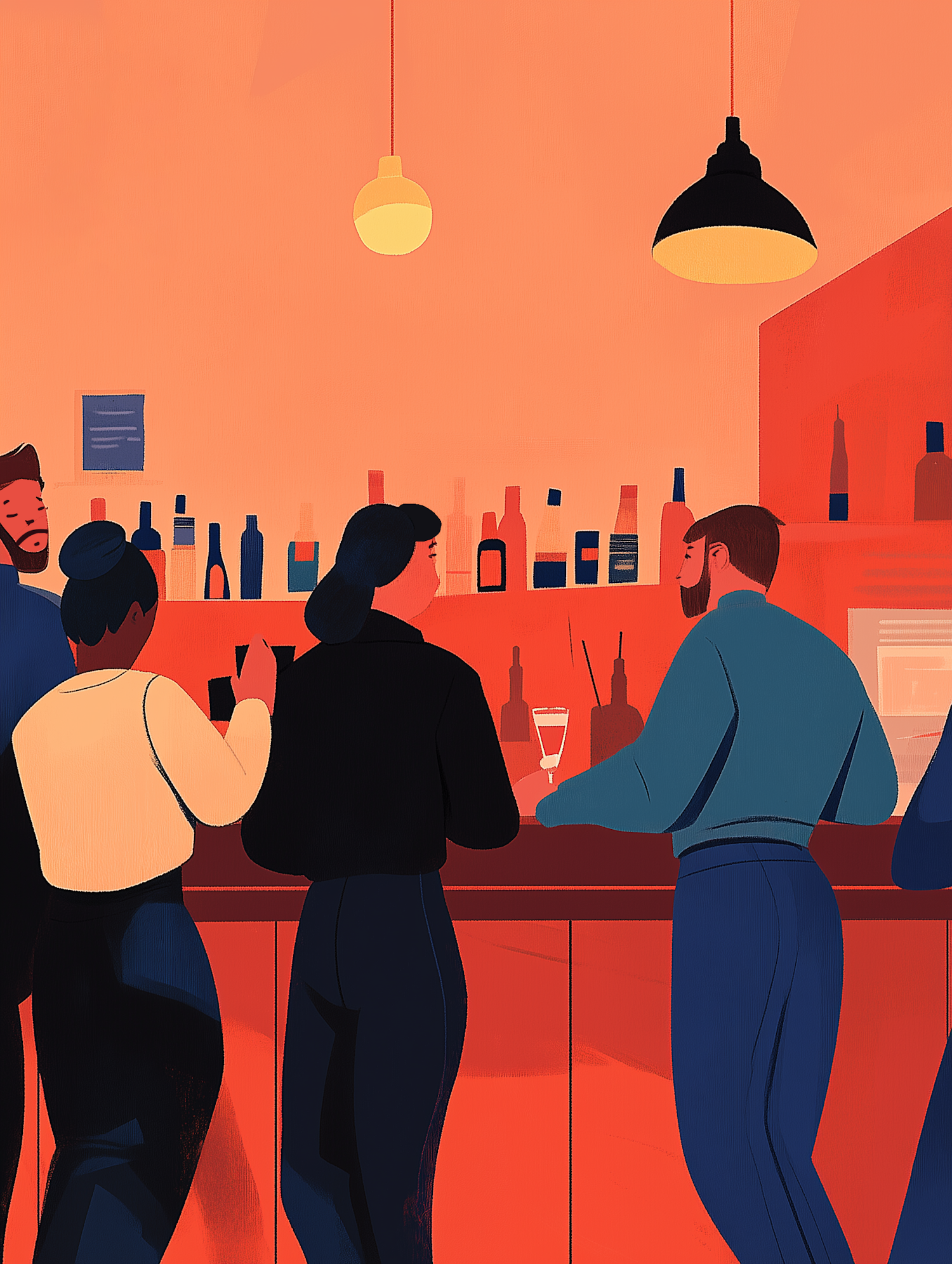 Illustration of a lively bar scene with diverse people, warm colors, and a modern vibe. Perfect for nightlife or social gathering themes.