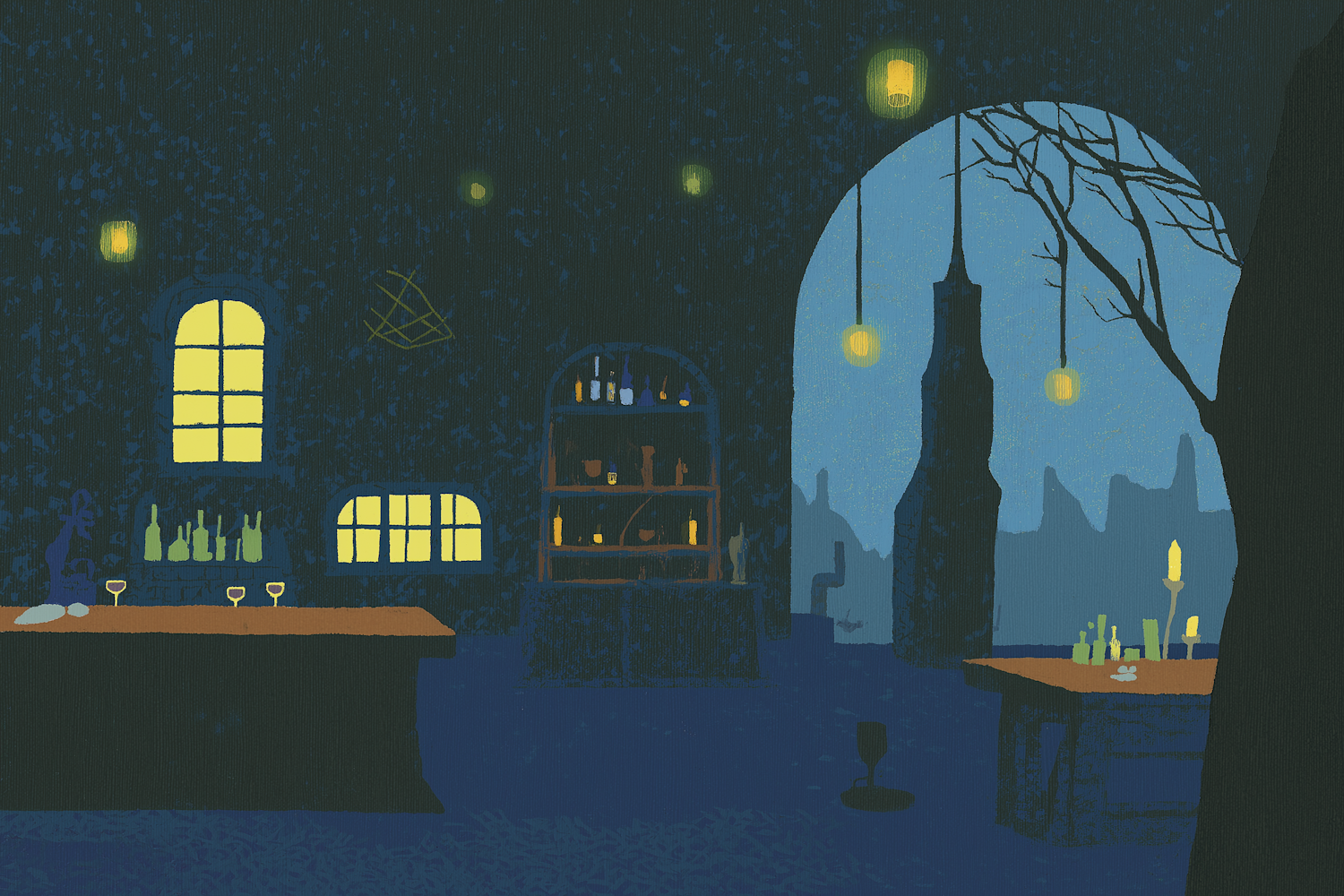 Moody room with glowing lights, bottles, and a cityscape view through an arched window. Dark blues and yellows create a mysterious ambiance.