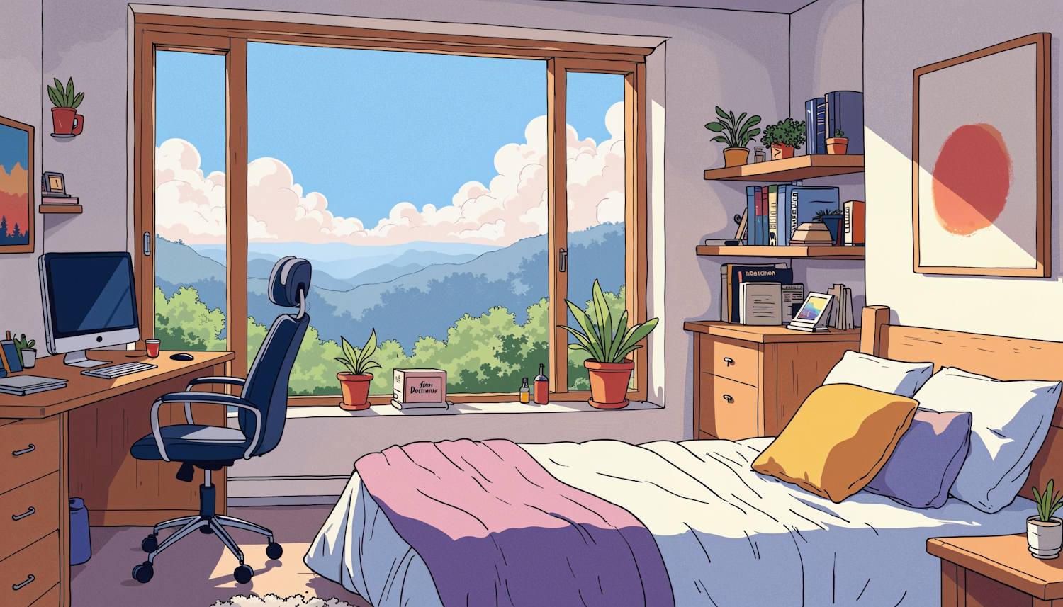 Cozy bedroom with a large window view of hills, a comfy bed, desk, and plants. Sunlit and inviting with a soft color palette.