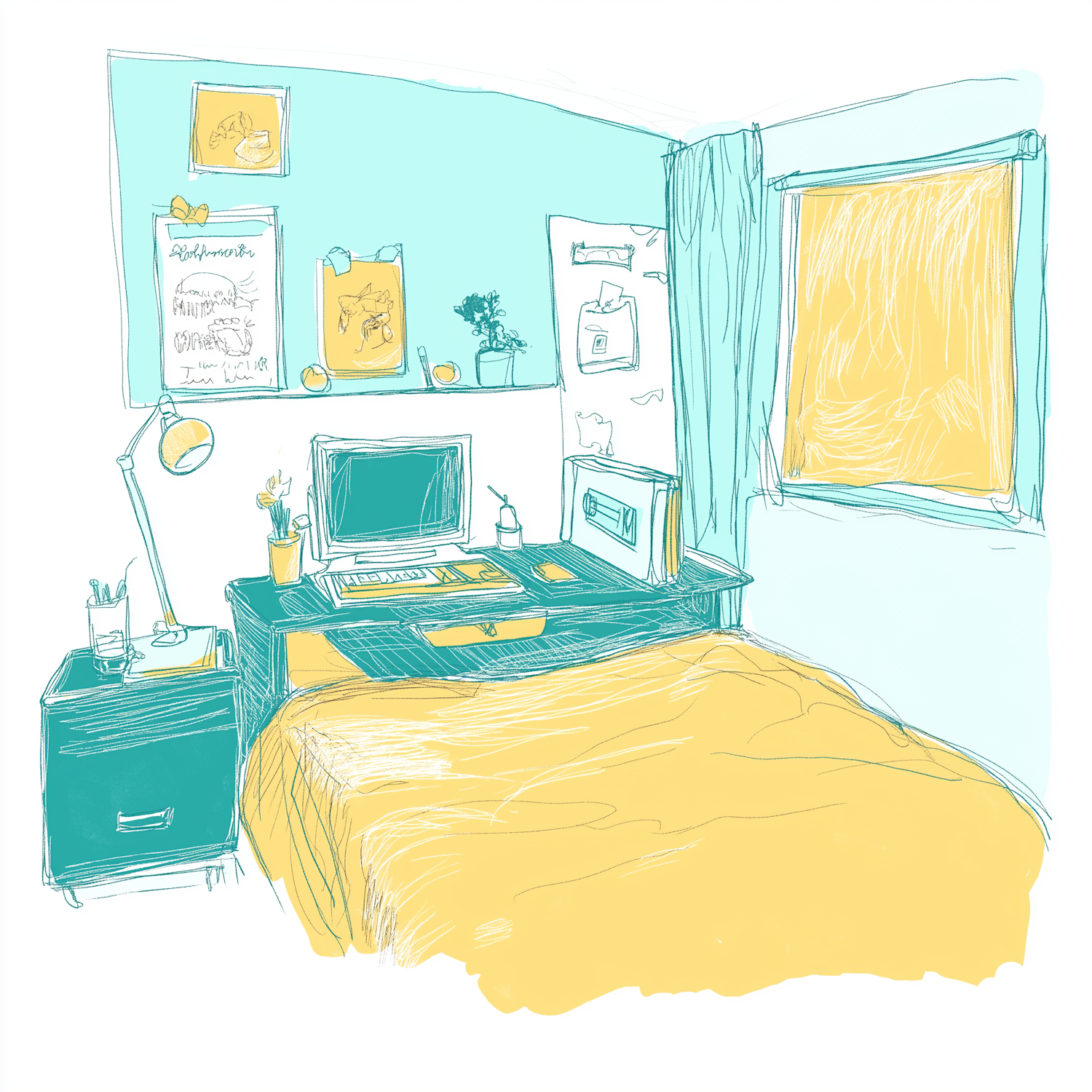 Cozy bedroom workspace with teal and yellow decor, featuring a desk, computer, and creative wall art.