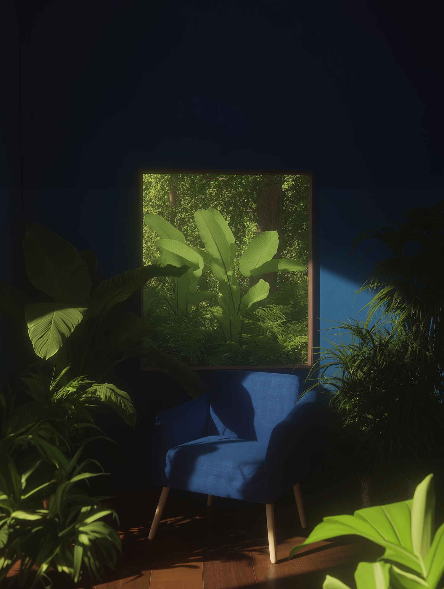 A cozy blue armchair in a plant-filled room with sunlight streaming through a window showcasing lush greenery outside.