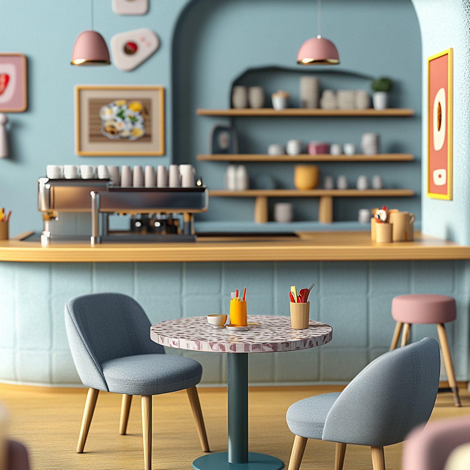 Chic café interior with modern design, featuring a terrazzo table, plush chairs, and a sleek espresso machine against soft blue walls.