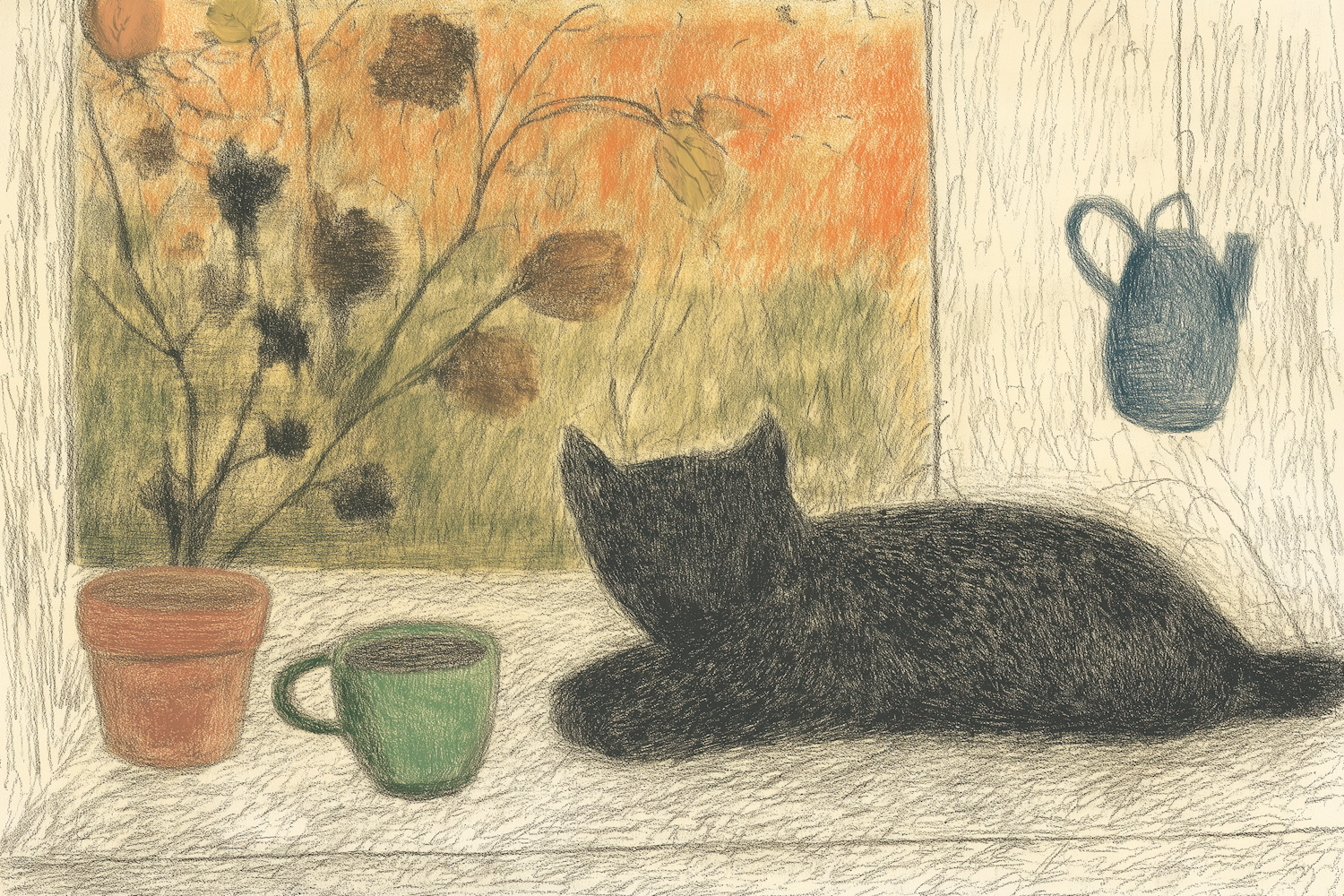 A black cat rests on a windowsill with a green mug and terracotta pot, set against an autumnal backdrop. Soft, sketch-like texture.