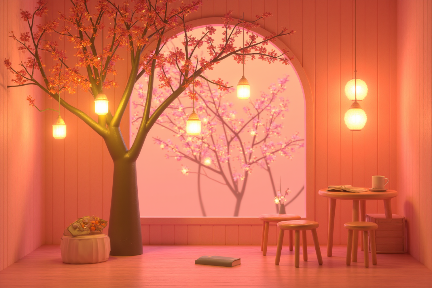 Warm pink room with a glowing tree, lanterns, and a cozy table setup. Perfect for a serene and inviting ambiance.