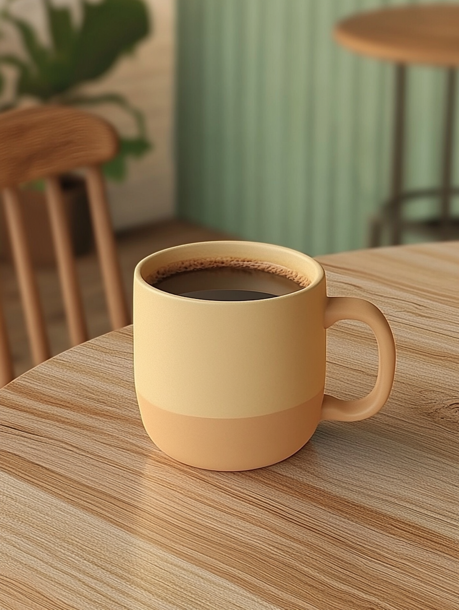 A cozy ceramic mug with coffee on a wooden table, set in a warm café ambiance with soft lighting and blurred background details.