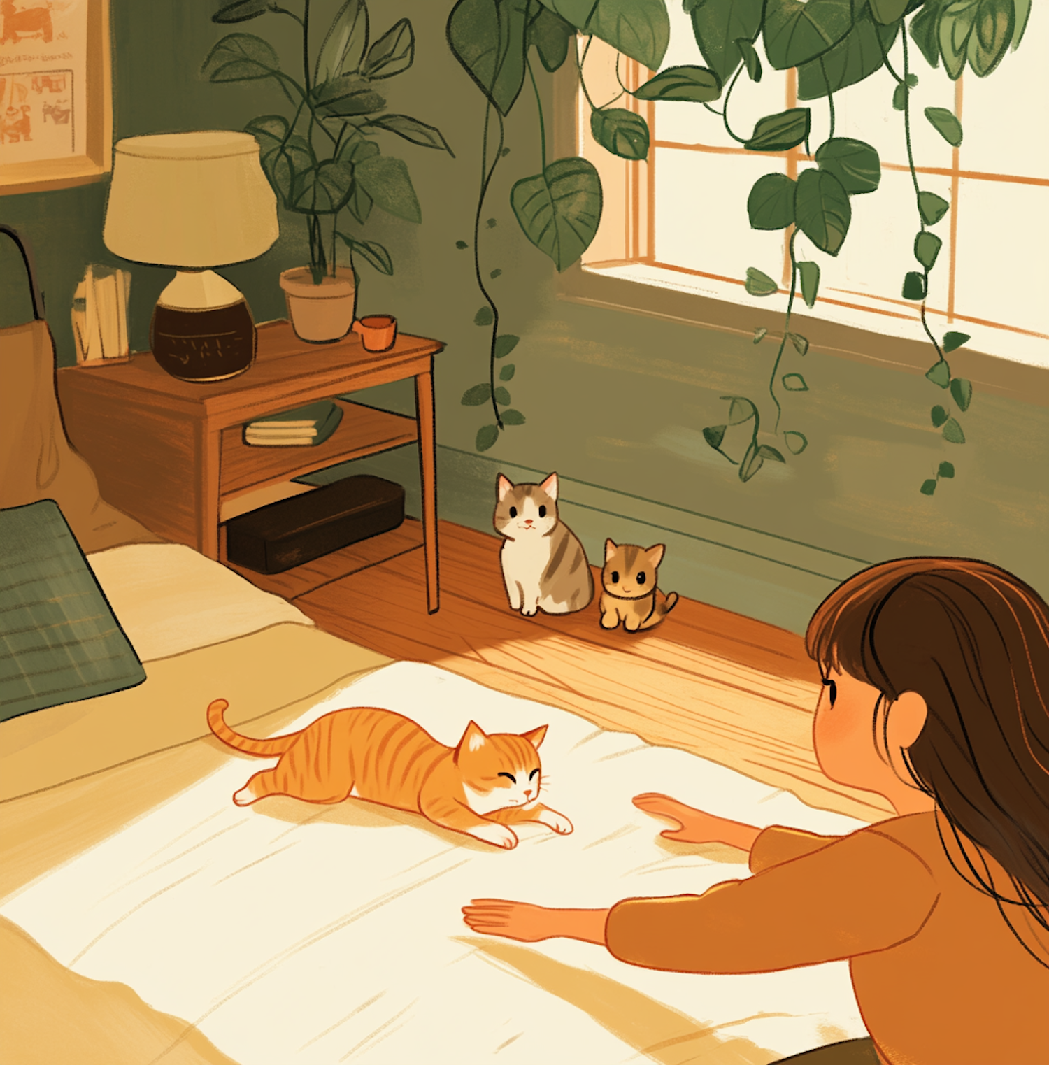 Cozy room with a girl reaching for a stretching tabby cat on a bed, surrounded by plants and two more cats by the window.