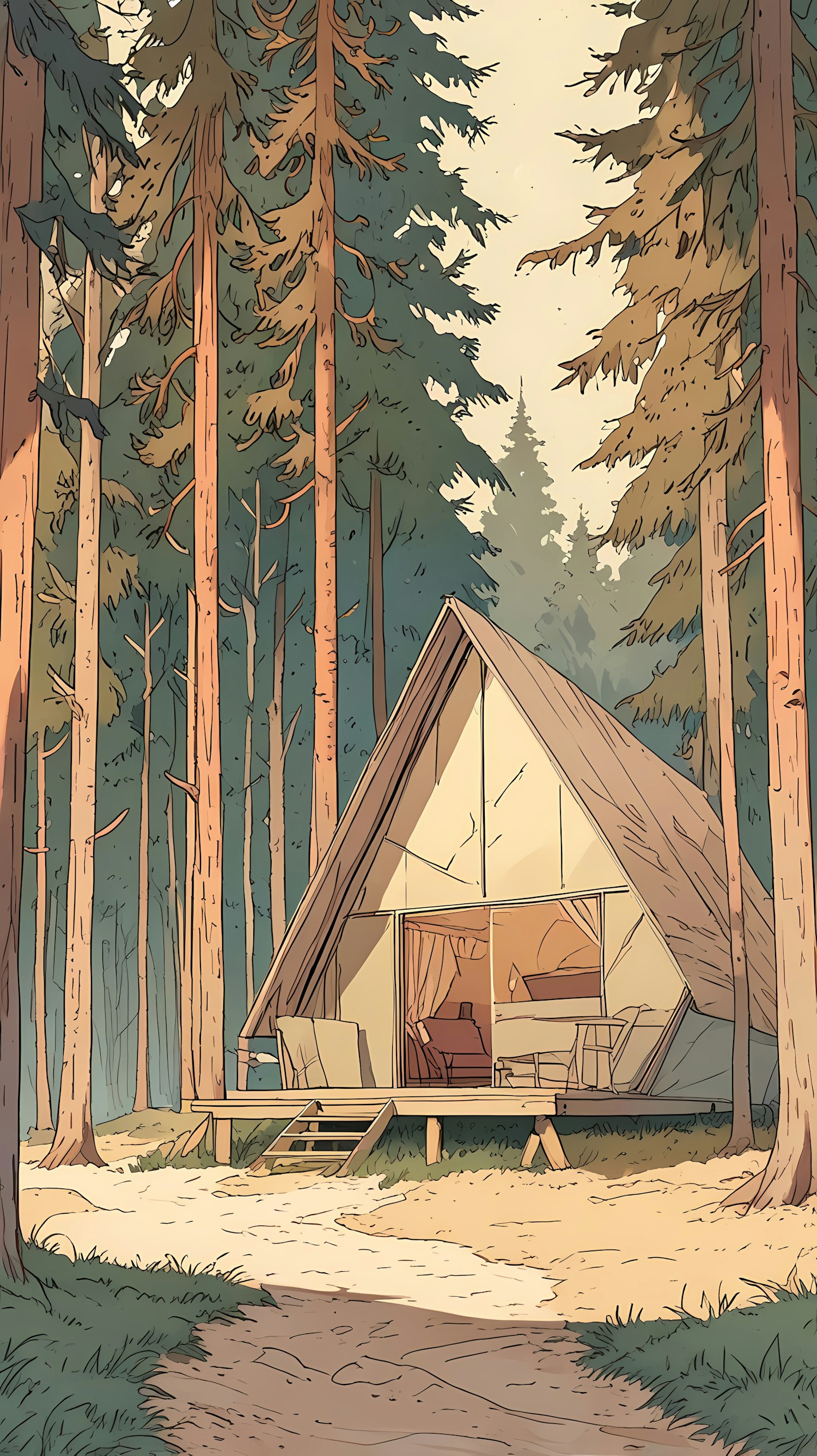 Illustration of an A-frame cabin surrounded by tall pine trees, highlighting its rustic charm and serene forest setting.