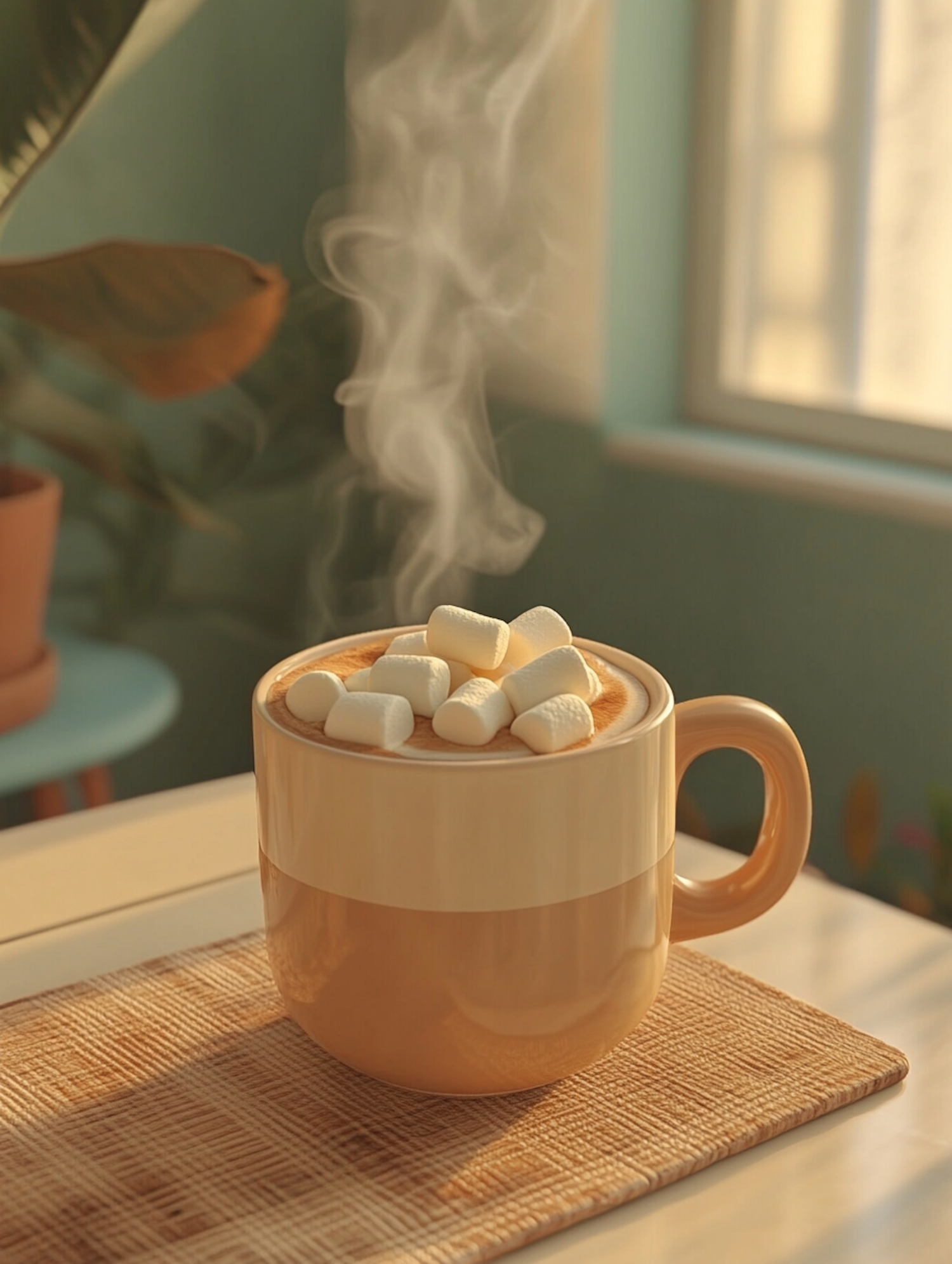 Warm hot chocolate with marshmallows in a cozy two-toned mug, steam rising in soft natural light by a window. Perfect for a relaxing moment.