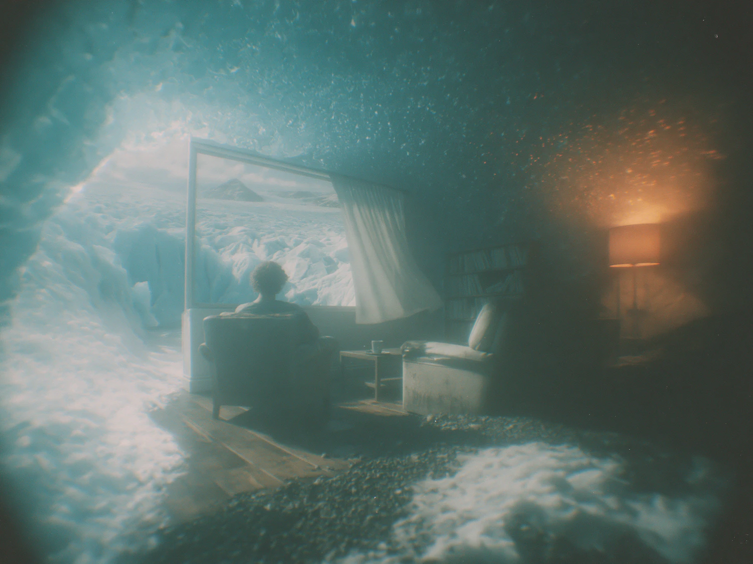 A surreal living room in an icy cave, with a person gazing at a glacier through a window, blending warmth and cold in a unique setting.