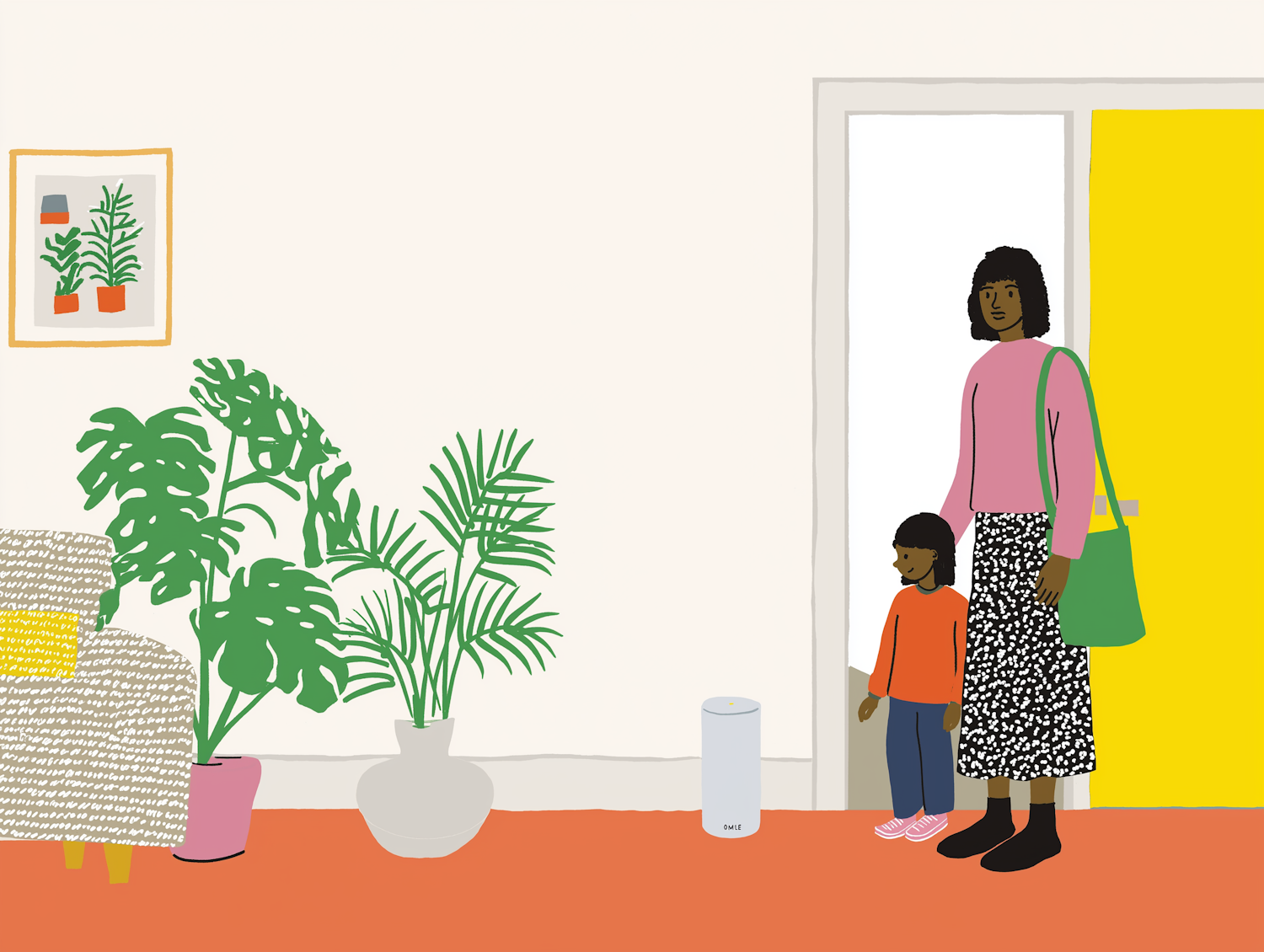 Illustration of a woman and child in a cozy room with plants, a patterned chair, and a bright yellow door.