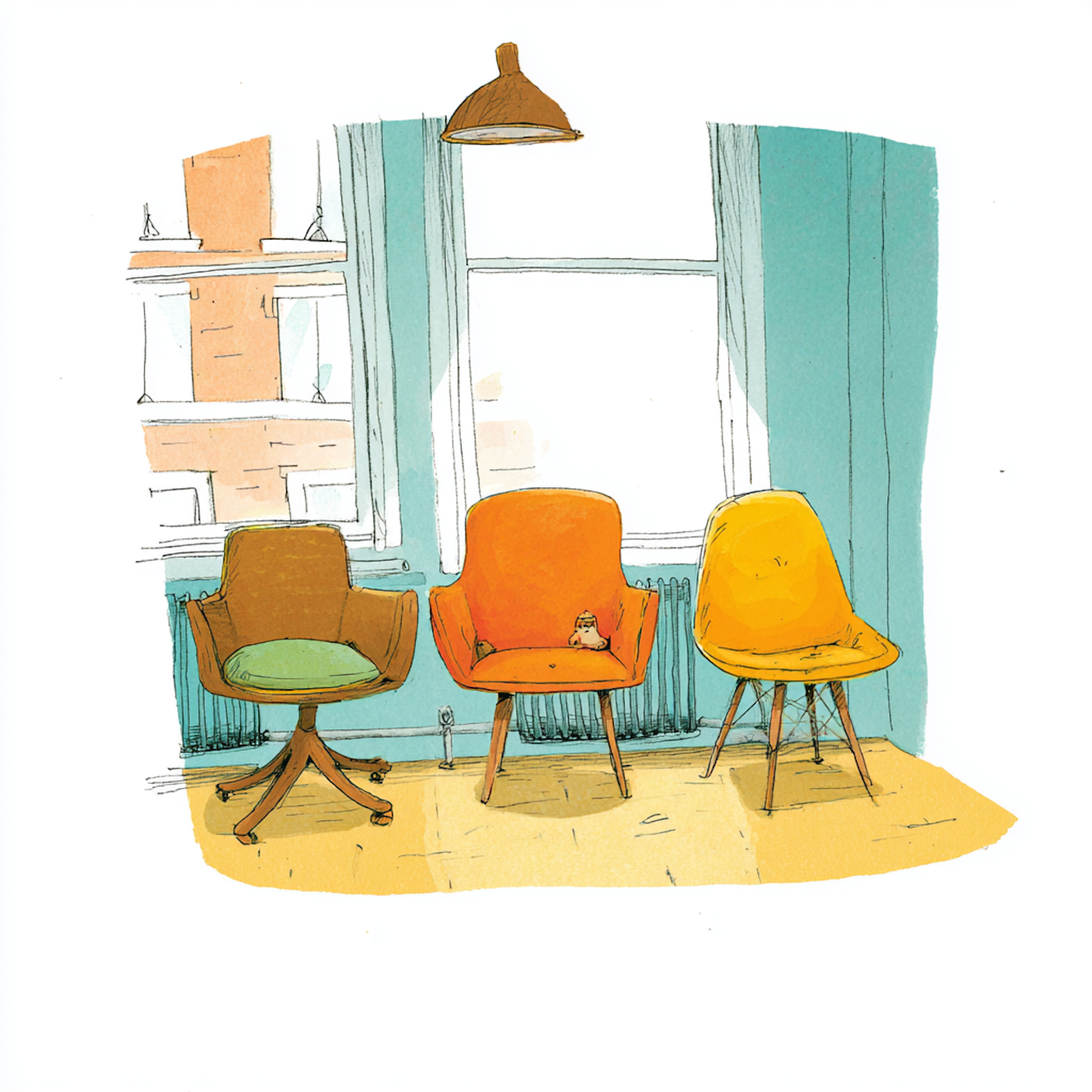 Charming illustration of three colorful chairs by a window, featuring a cozy interior with a small stuffed toy on the orange chair.