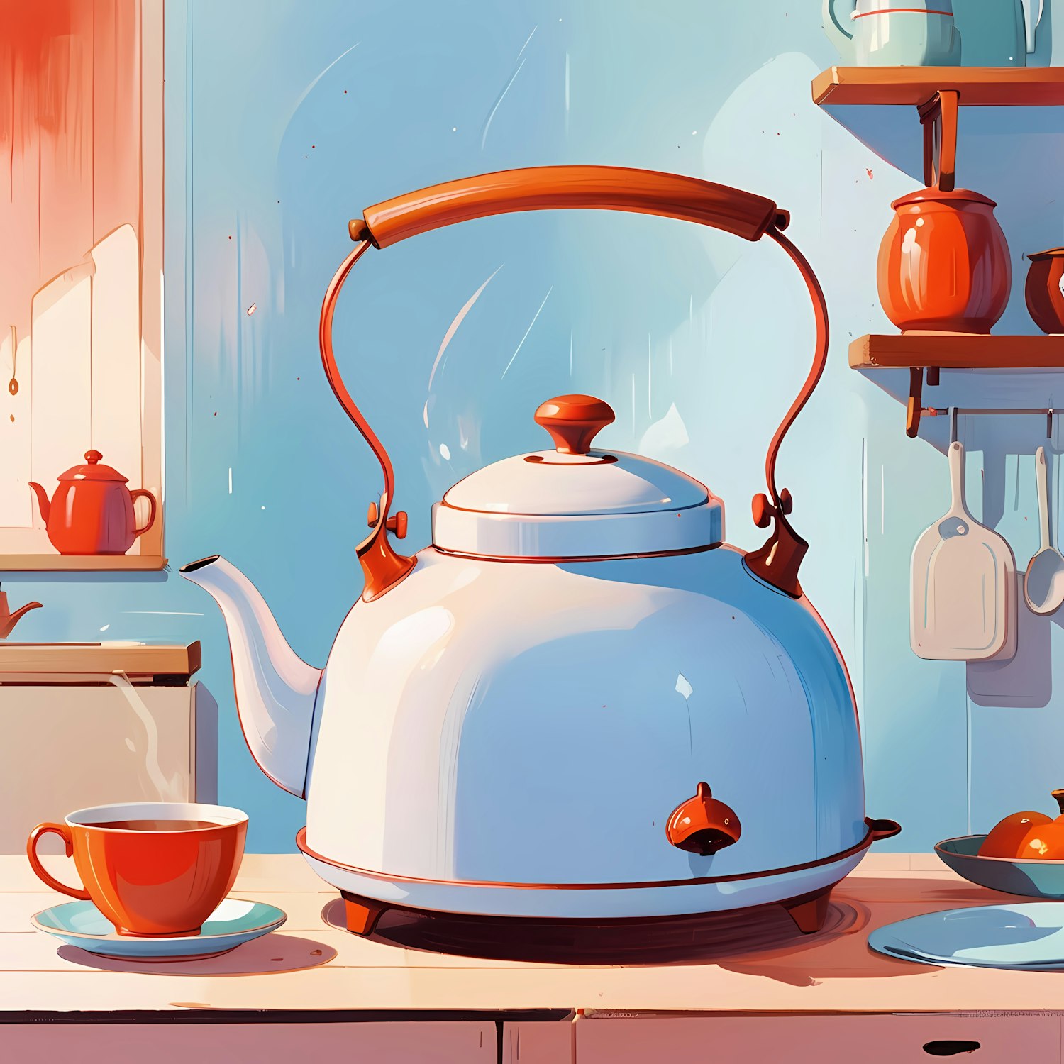 Cozy kitchen illustration with a white kettle, steaming tea, and warm red accents. Perfect for a nostalgic and inviting vibe.