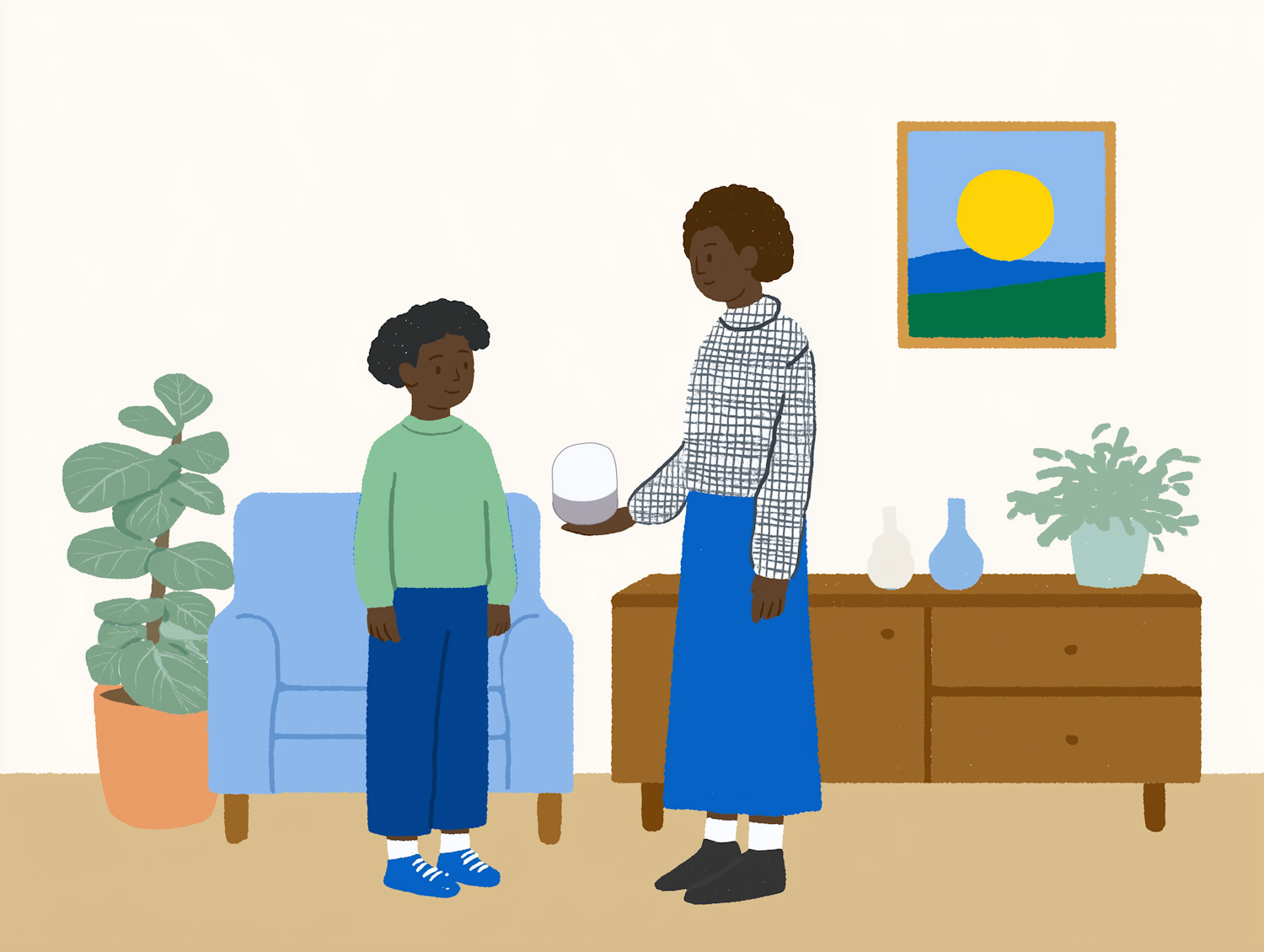 Illustration of a cozy living room with two people interacting, featuring a modern device, plants, and warm decor.