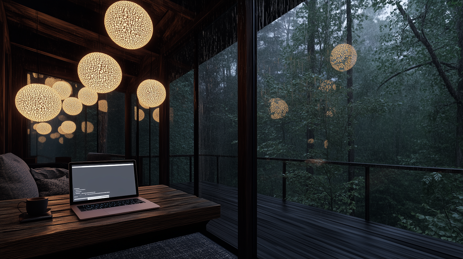 Cozy room with pendant lights, laptop, and forest view through rain-soaked windows. Perfect for relaxation or work.