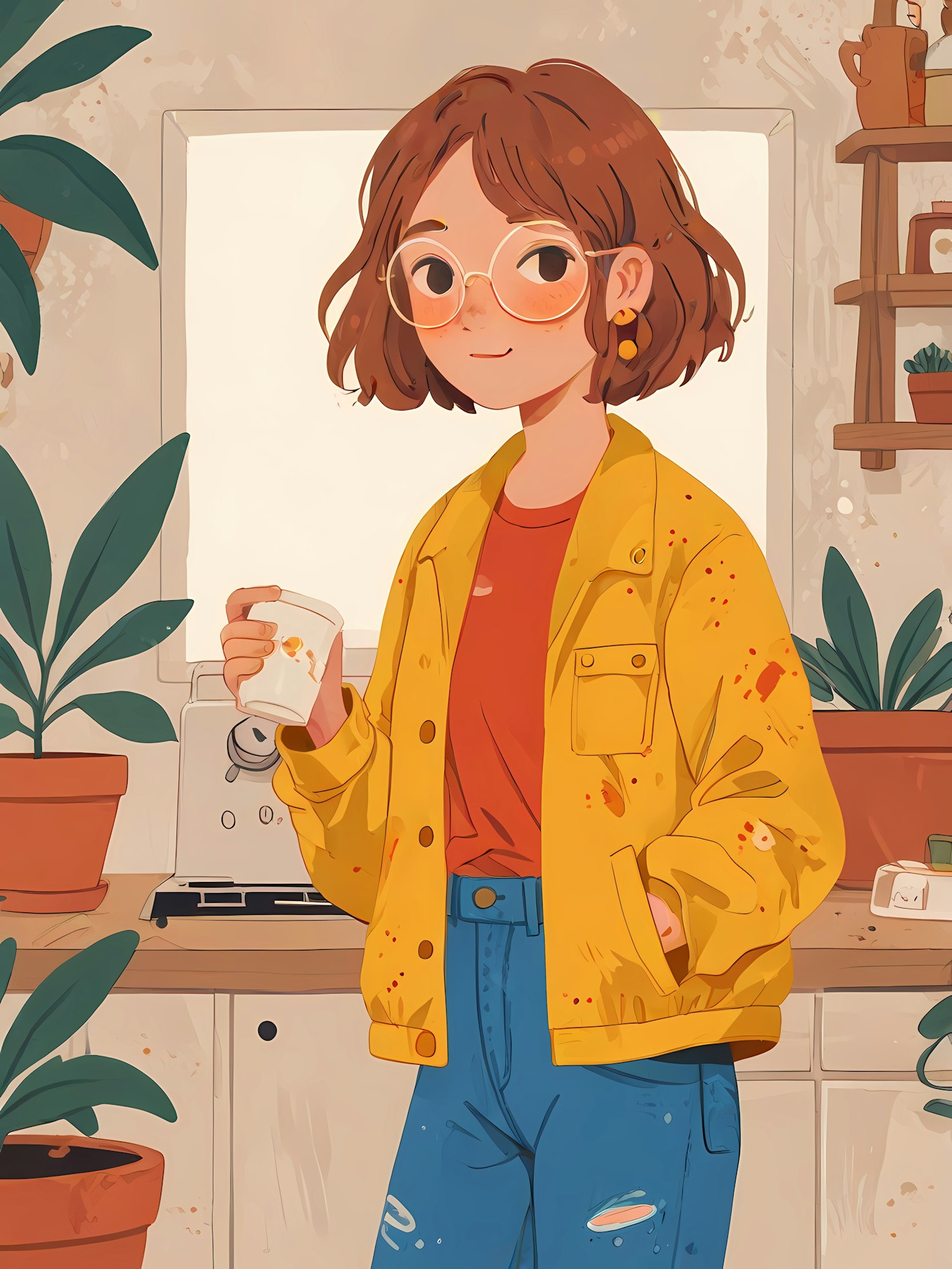 Illustration of a young woman in a yellow jacket holding a cup in a cozy kitchen with plants and warm colors.