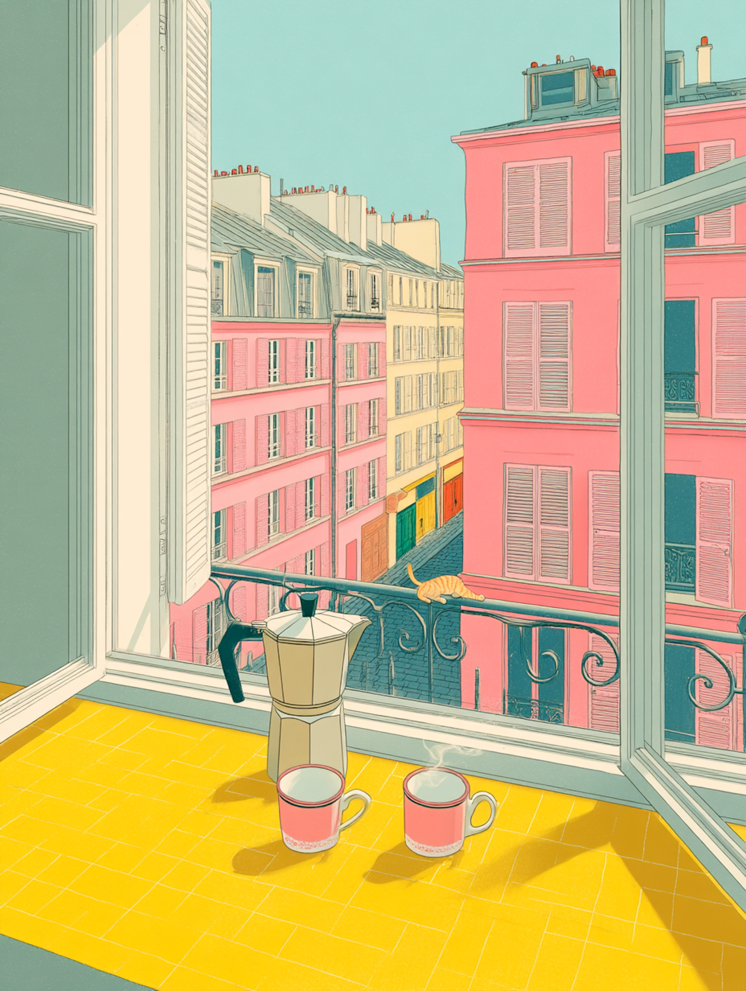 Charming Parisian view with pastel buildings, a coffee maker, steaming mugs, and a lounging cat on a sunny windowsill.