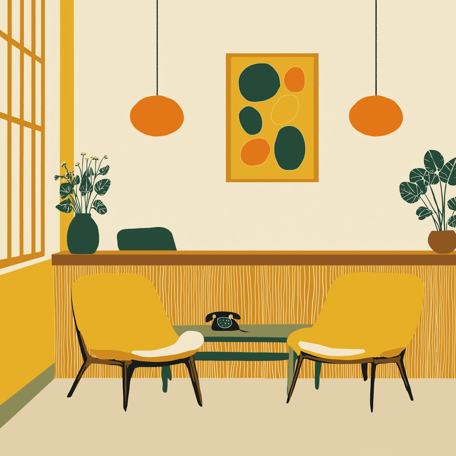Stylish retro-inspired interior with yellow chairs, a wood-textured desk, and vibrant abstract art. Warm tones and greenery add charm.