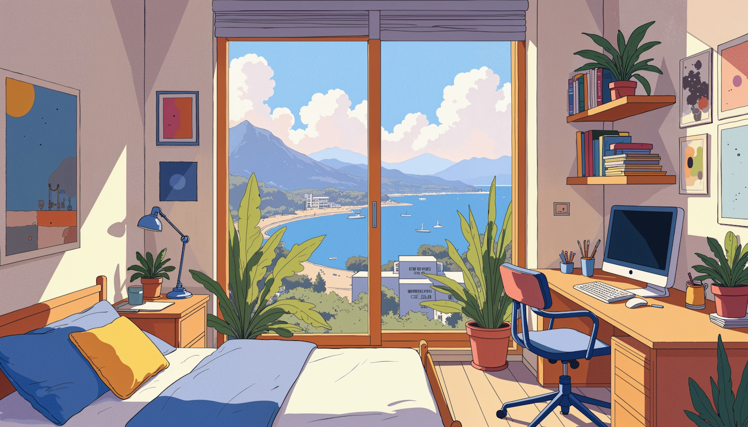 Cozy bedroom with a stunning coastal view, vibrant decor, and a modern workspace. Features plants, abstract art, and a serene bay view.