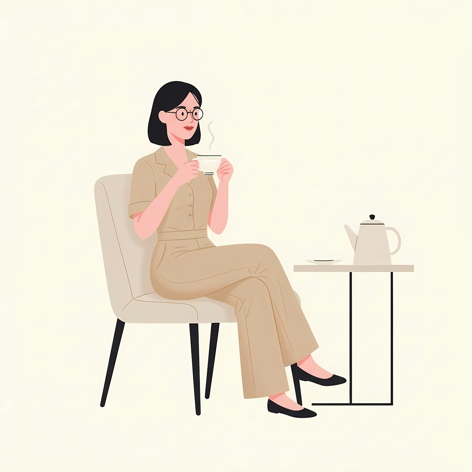 Illustration of a woman enjoying tea in a minimalist setting, featuring a beige outfit and a small table with a teapot.