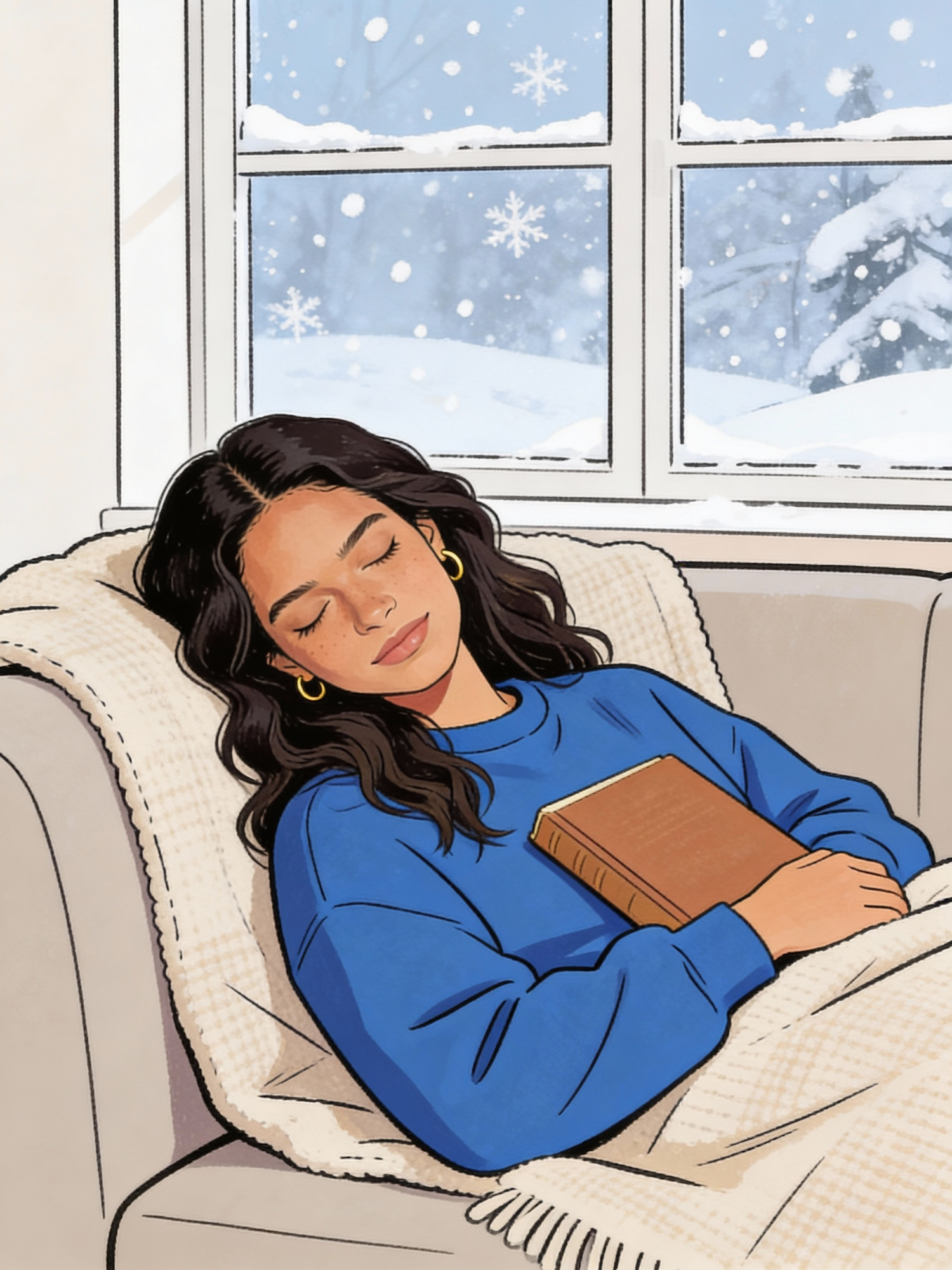 A cozy winter scene of a woman resting on a couch with a book, framed by a snowy window view. Perfect for relaxation vibes.