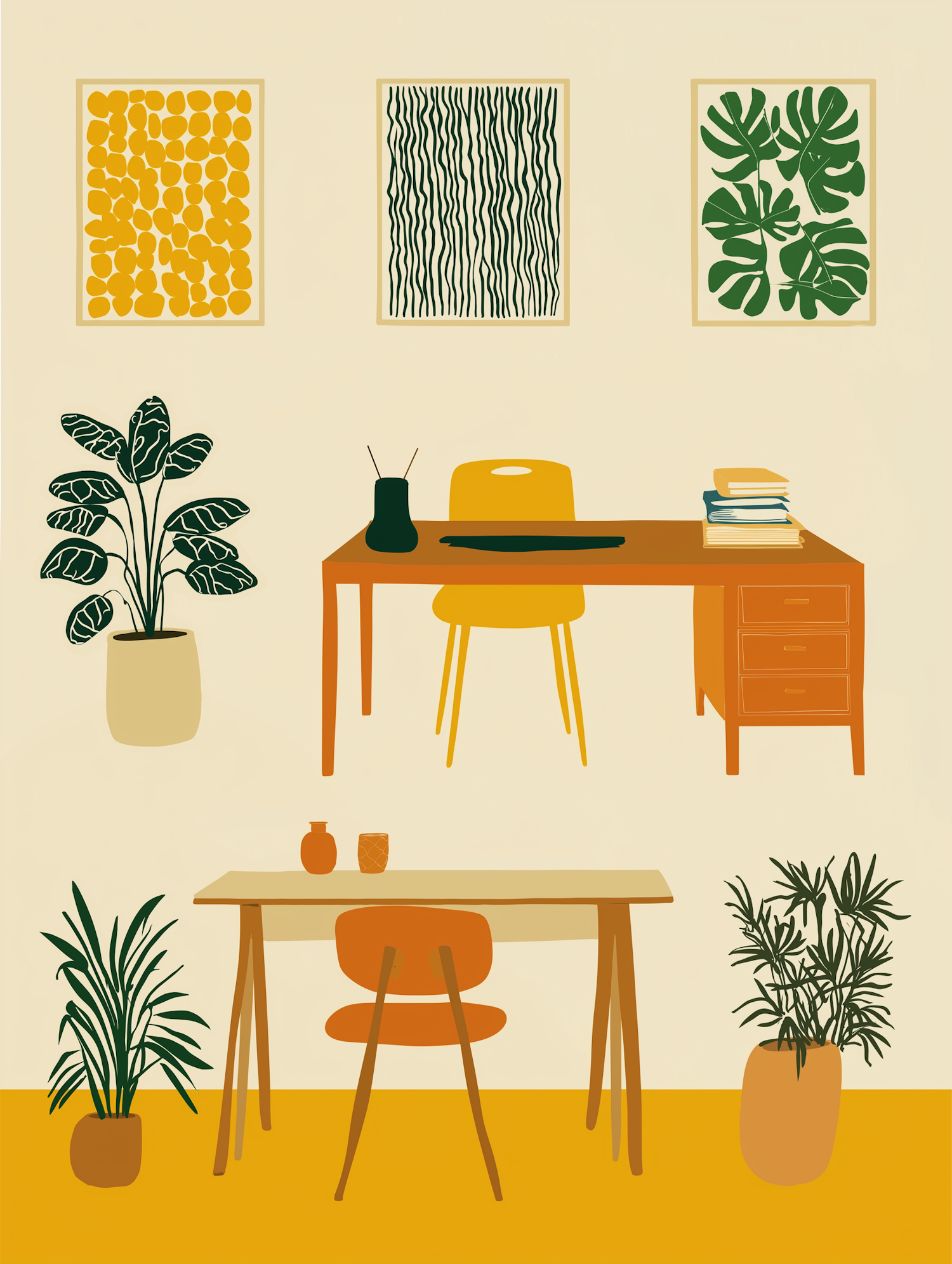 Stylish workspace illustration with desks, chairs, potted plants, and abstract wall art in warm yellow and green tones.