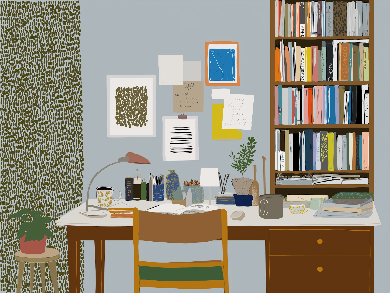 Illustrated cozy workspace with a wooden desk, books, plants, and a colorful bookshelf, perfect for inspiration and creativity.