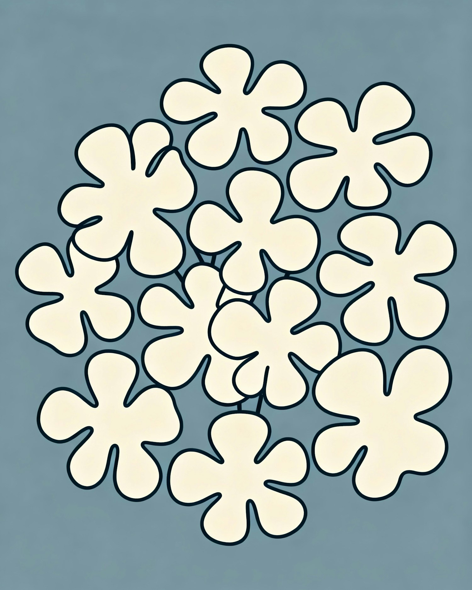 Stylized cream-colored flowers with black outlines on a muted blue background, creating a harmonious and minimalist design.