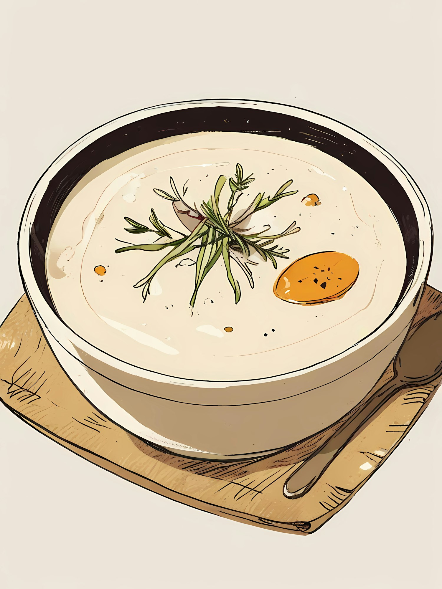 Illustrated bowl of creamy soup with rosemary and oil, set on a wooden coaster with a spoon. Elegant and inviting presentation.