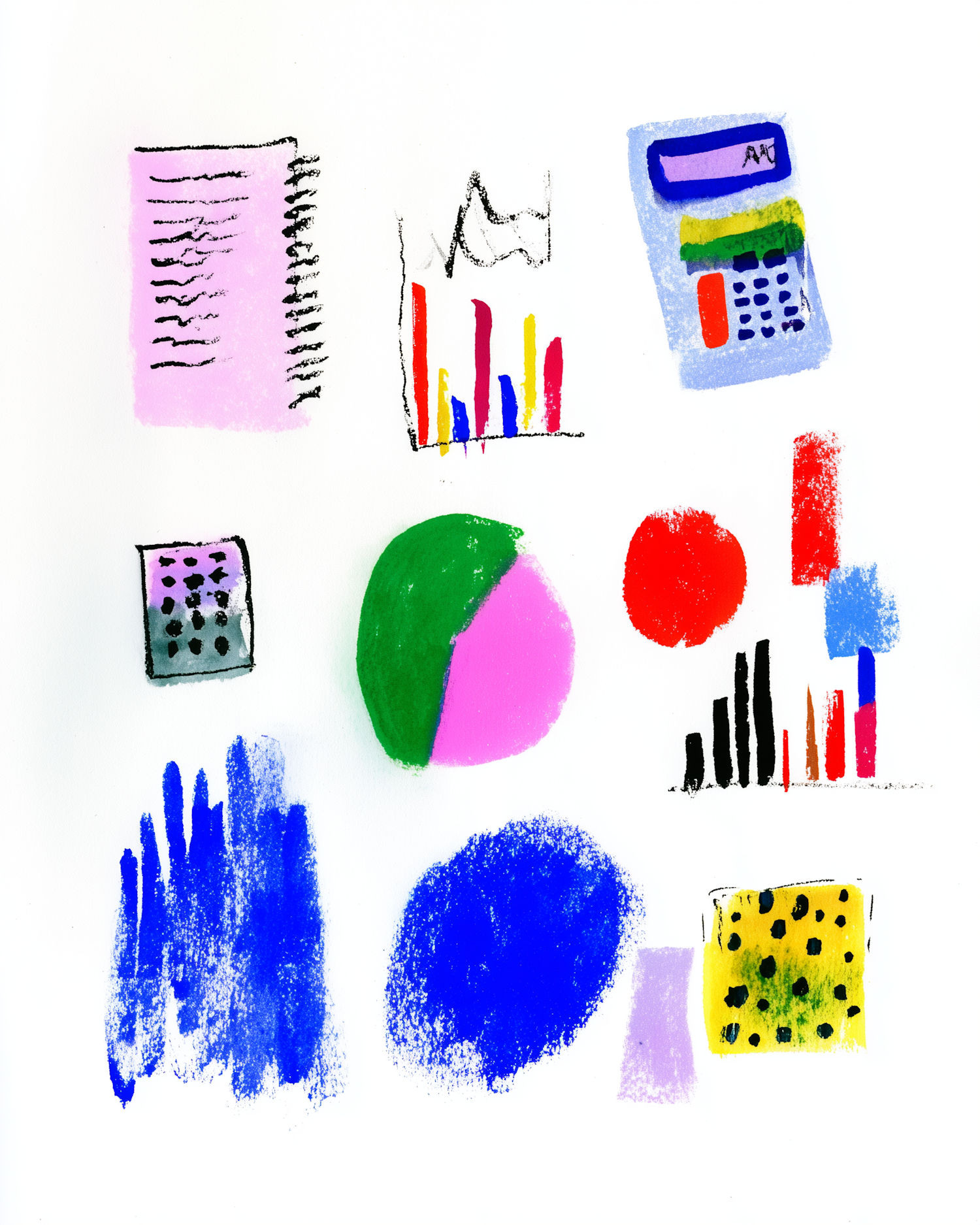 A colorful illustration of charts, graphs, and abstract shapes, perfect for creative data visualization or office-themed designs.