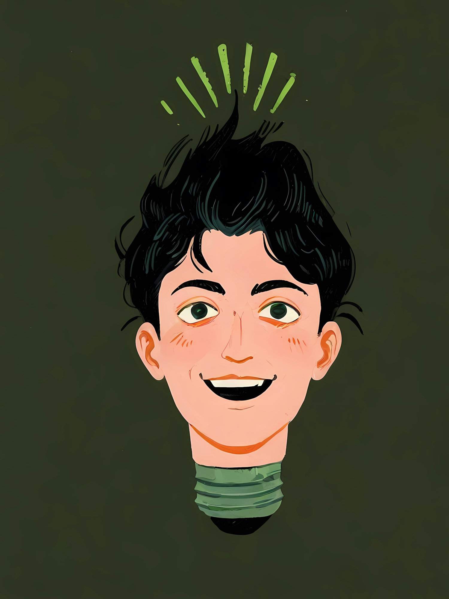 Stylized illustration of a head with blurred face, dynamic black hair, and green scarf on dark green background.