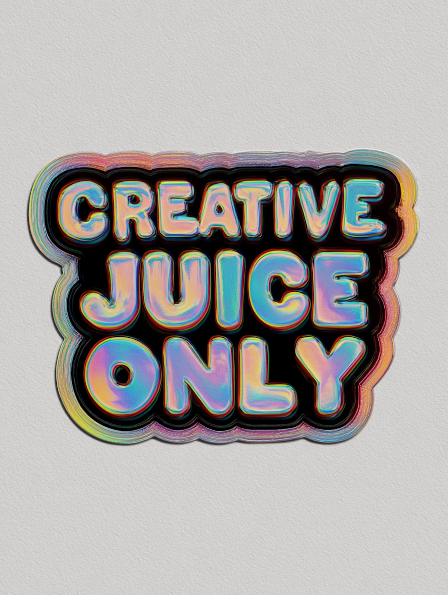 Bold and colorful 'Creative Juice Only' text design with an iridescent effect on a neutral background, perfect for creative inspiration.