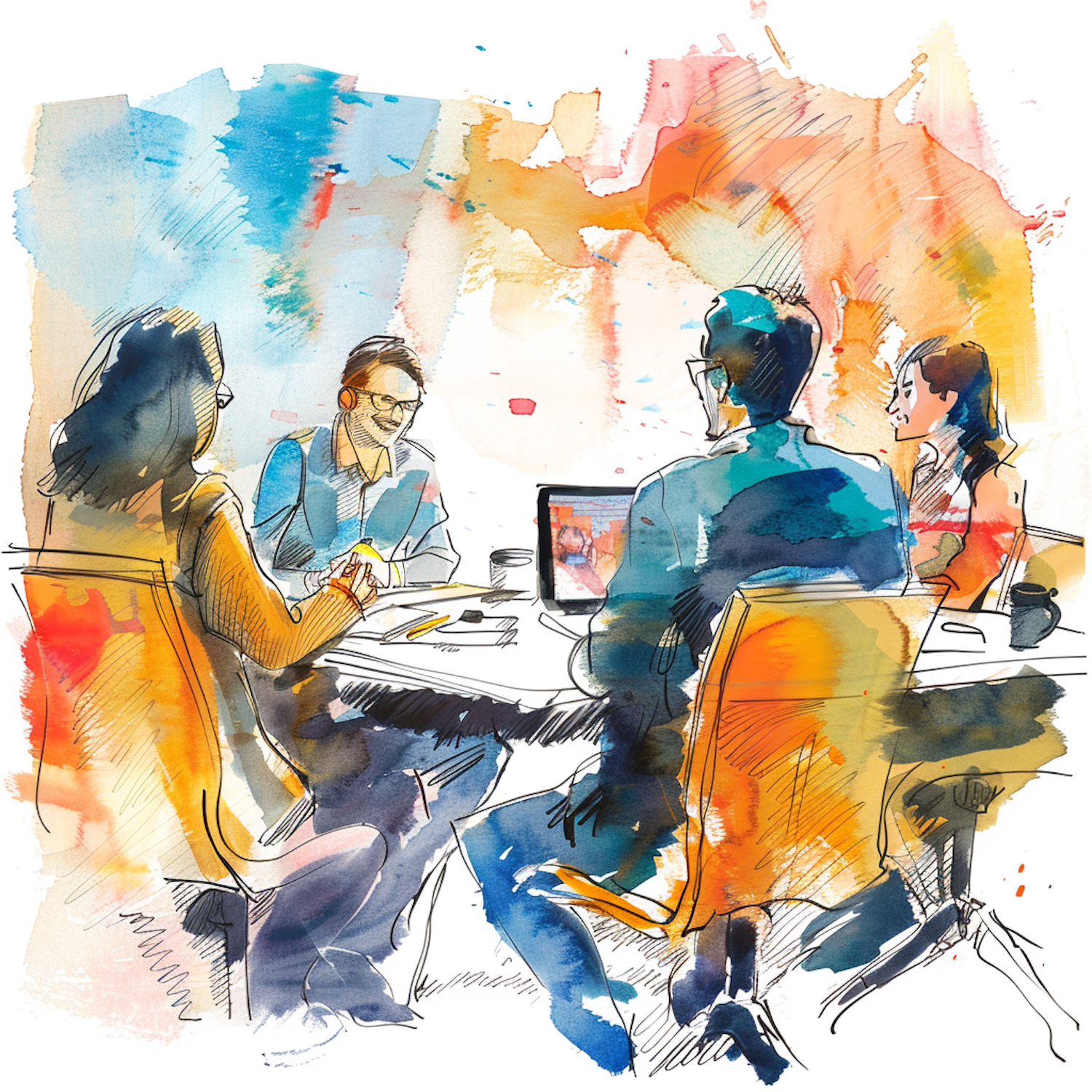 A colorful watercolor-style illustration of a team collaborating around a table, with a laptop and vibrant abstract background.