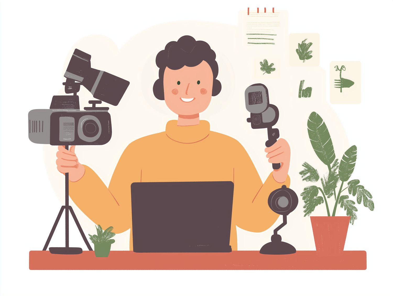 Illustration of a smiling person with cameras, a laptop, and plants, creating a cozy and tech-savvy workspace vibe.