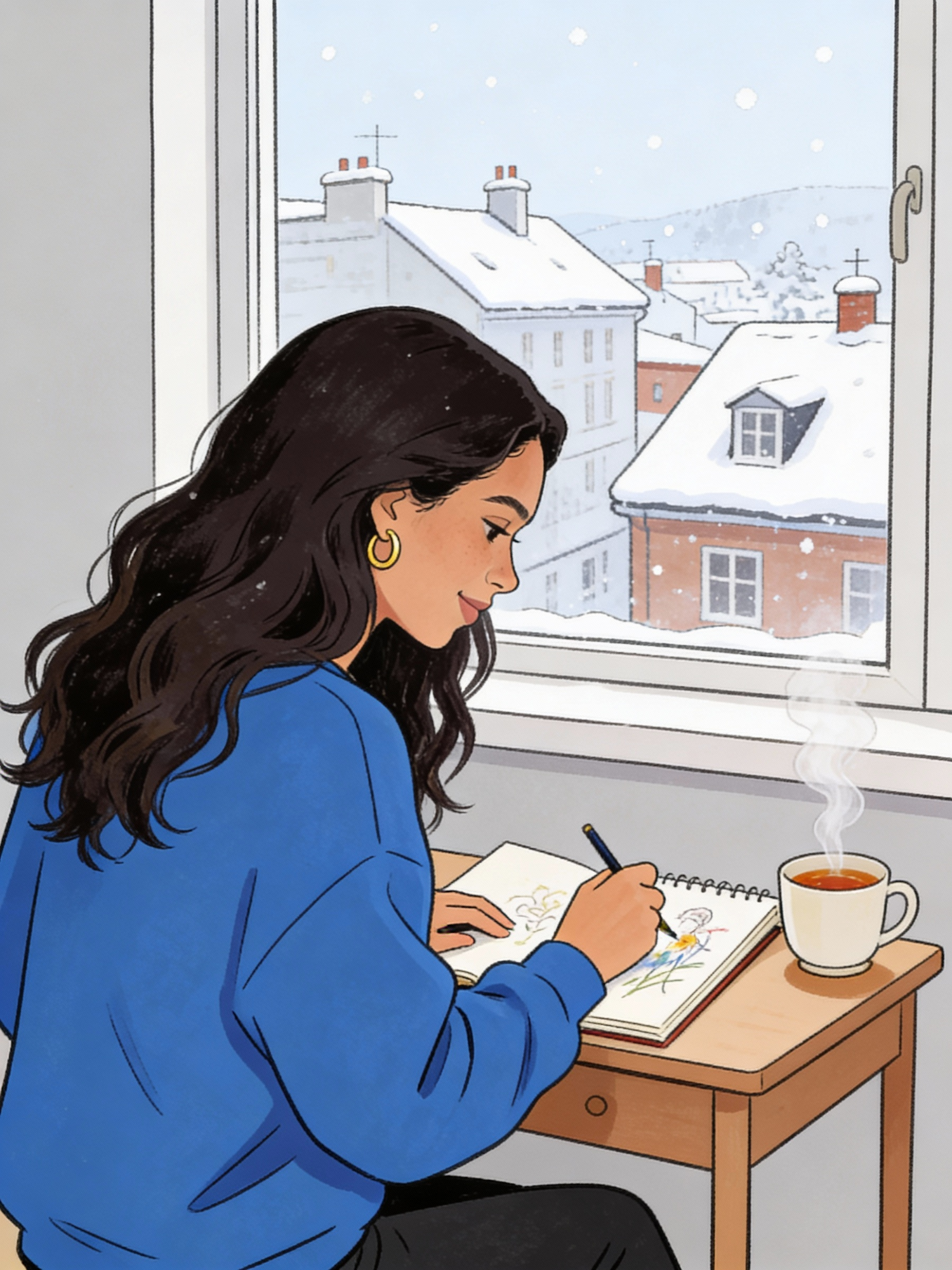 A woman sketches by a snowy window, wearing a blue sweater, with a steaming cup of tea nearby, creating a cozy and creative atmosphere.