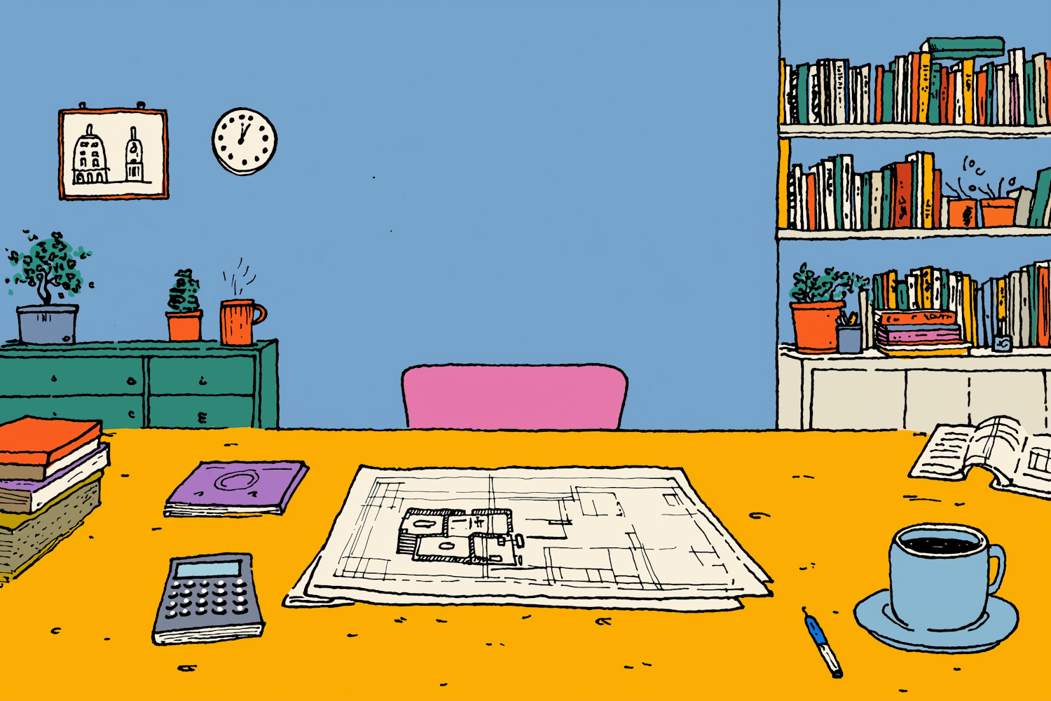 Illustration of a workspace with a yellow desk, blueprints, books, and a coffee cup, set against a blue wall with shelves and decor.