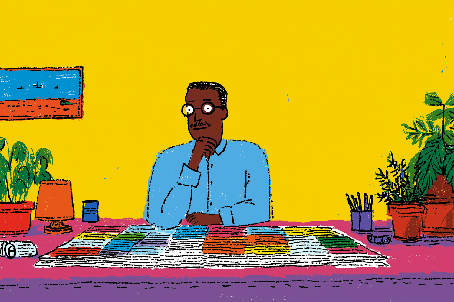 A vibrant illustration of a man in a blue shirt sitting at a colorful table with plants and art supplies, set against a bright yellow background.