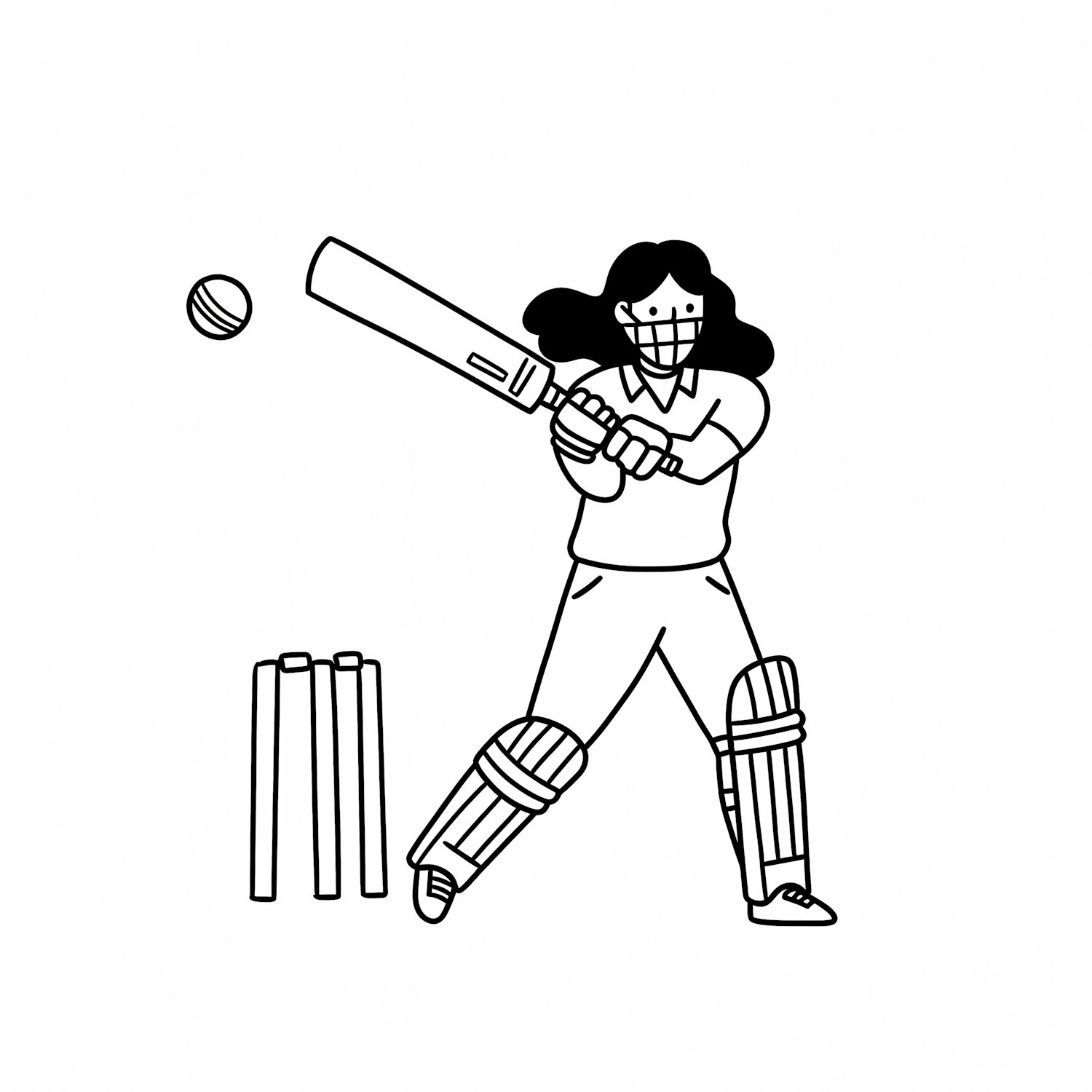 Illustration of a cricket player mid-swing, wearing protective gear, with stumps and a ball in motion, in a clean black-and-white style.