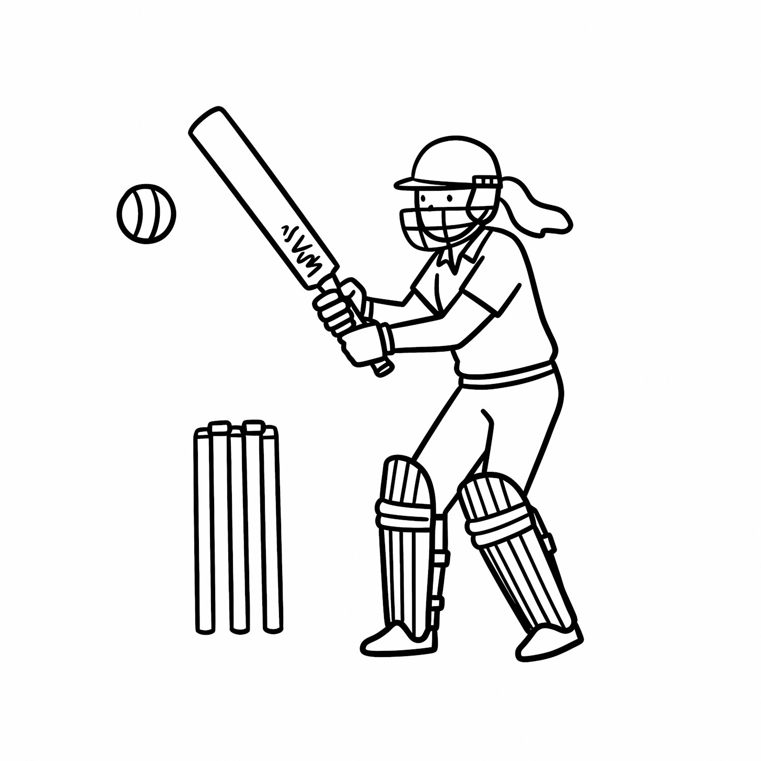 Line art of a cricket player in action, wearing protective gear and holding a bat, with stumps and a ball in the scene.