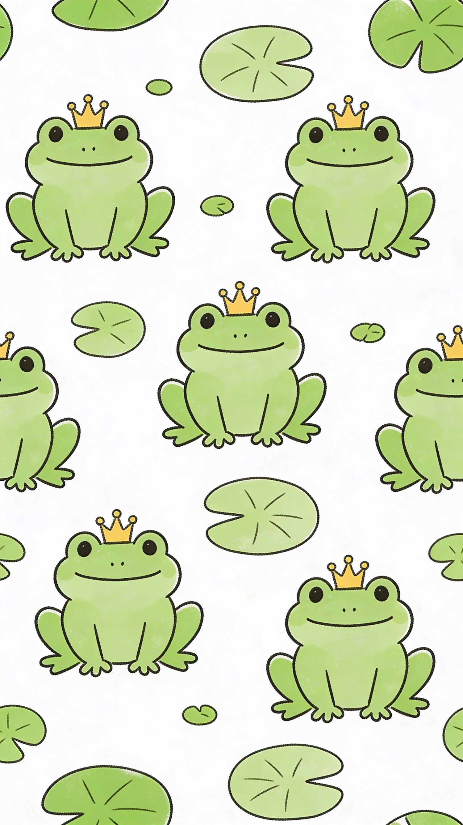 A playful pattern of cartoon frogs wearing crowns, surrounded by lily pads on a white background, perfect for kids' designs.