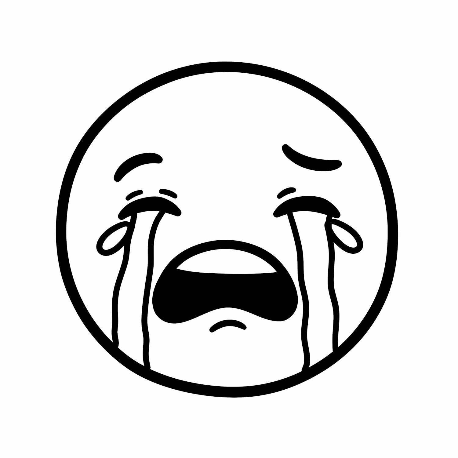 Black-and-white crying face emoji illustration with bold lines and expressive features, perfect for conveying sadness or emotion.