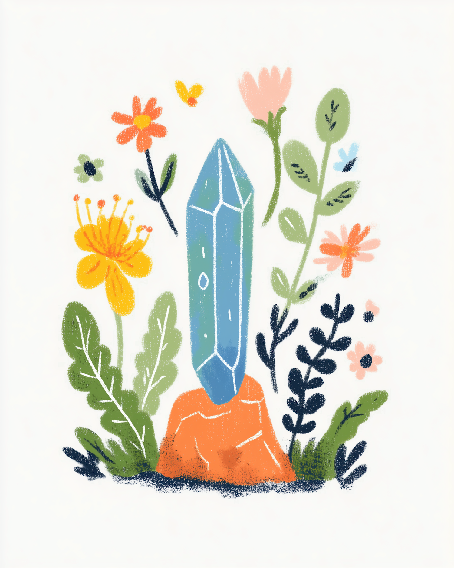 A colorful illustration of a blue crystal on an orange rock surrounded by vibrant flowers and greenery, set against a clean white background.