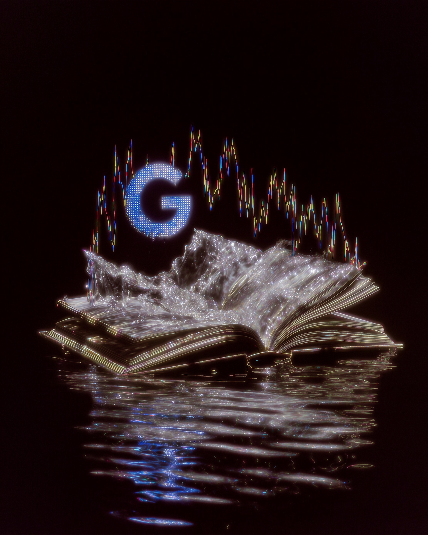 A glowing 'G' above a crystalline book with water-like pages and a stock graph, set against a dark background for a striking visual.