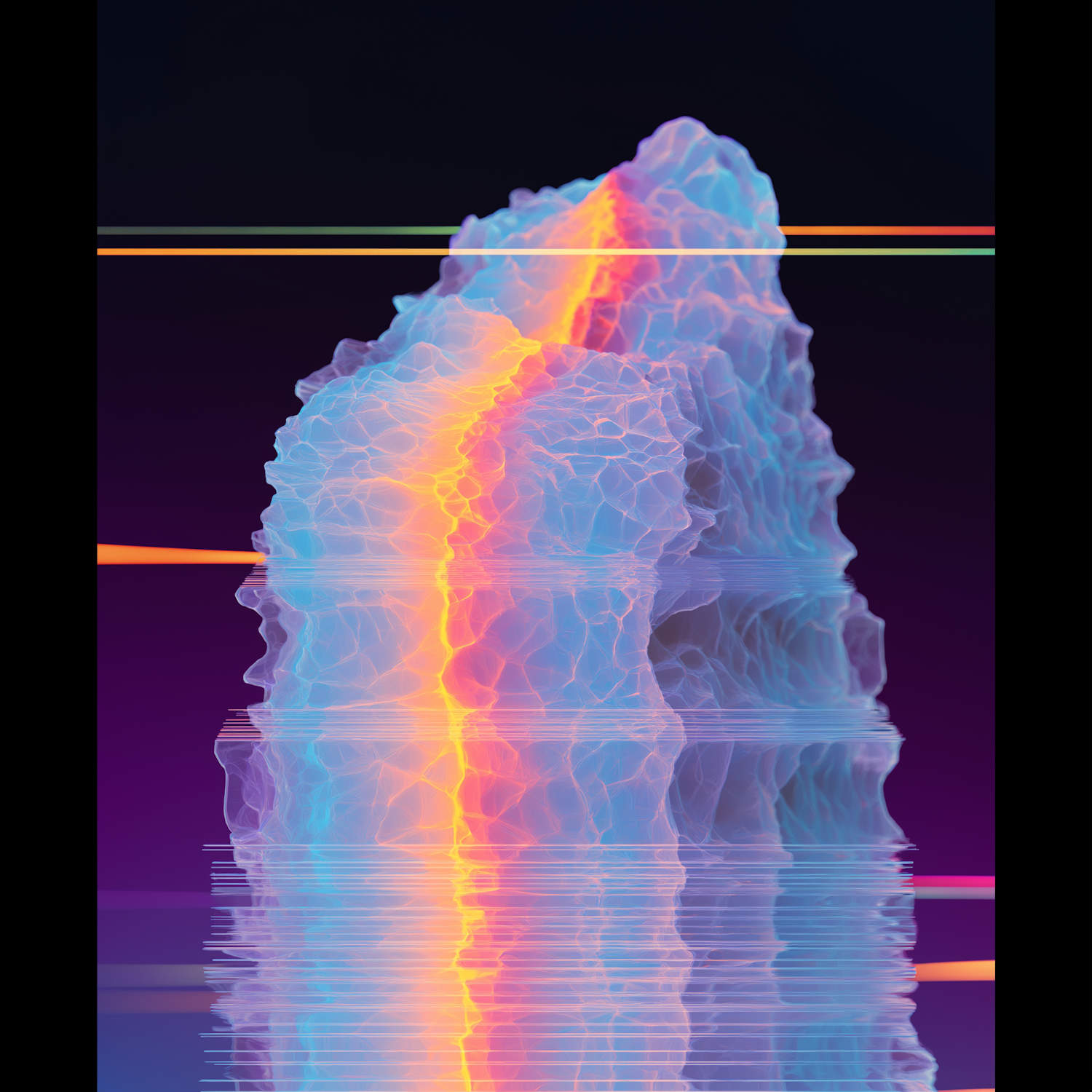 A glowing crystalline structure with vibrant colors and a radiant fissure, set against a dark gradient background with light streaks.