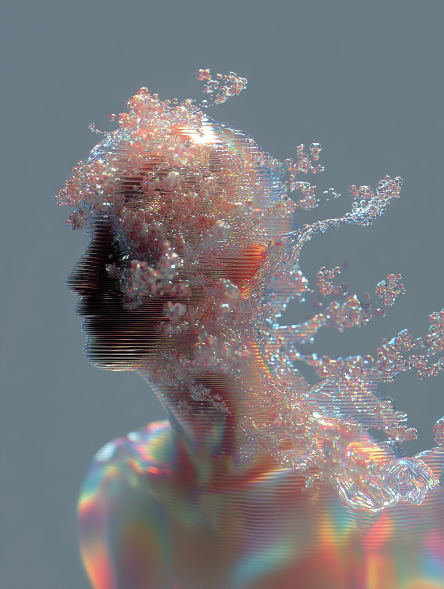 A stunning digital artwork of a human silhouette dissolving into iridescent, crystalline particles against a neutral background.