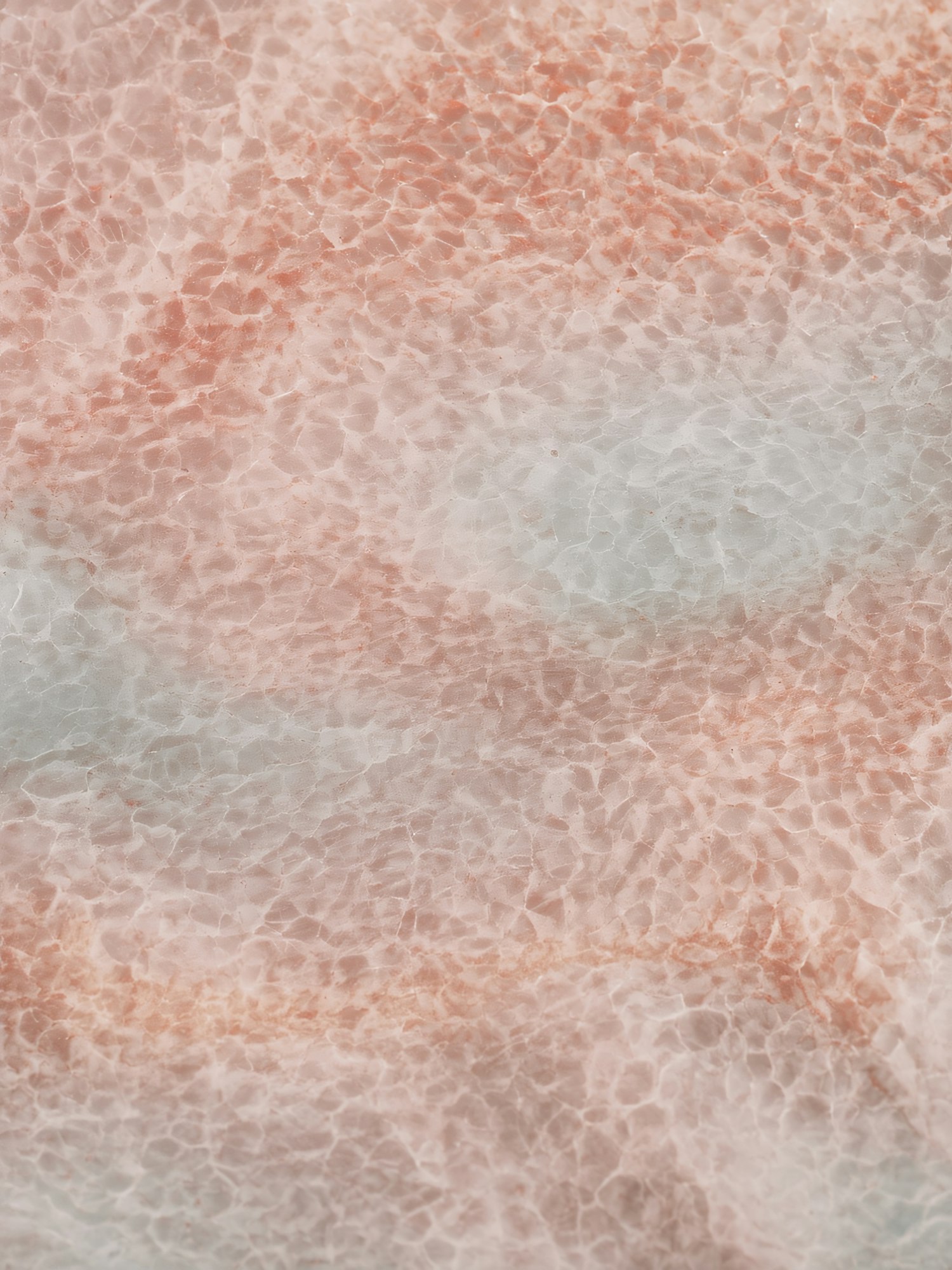 Close-up of a textured surface with pink and white hues, resembling polished stone or mineral with intricate crystalline patterns.