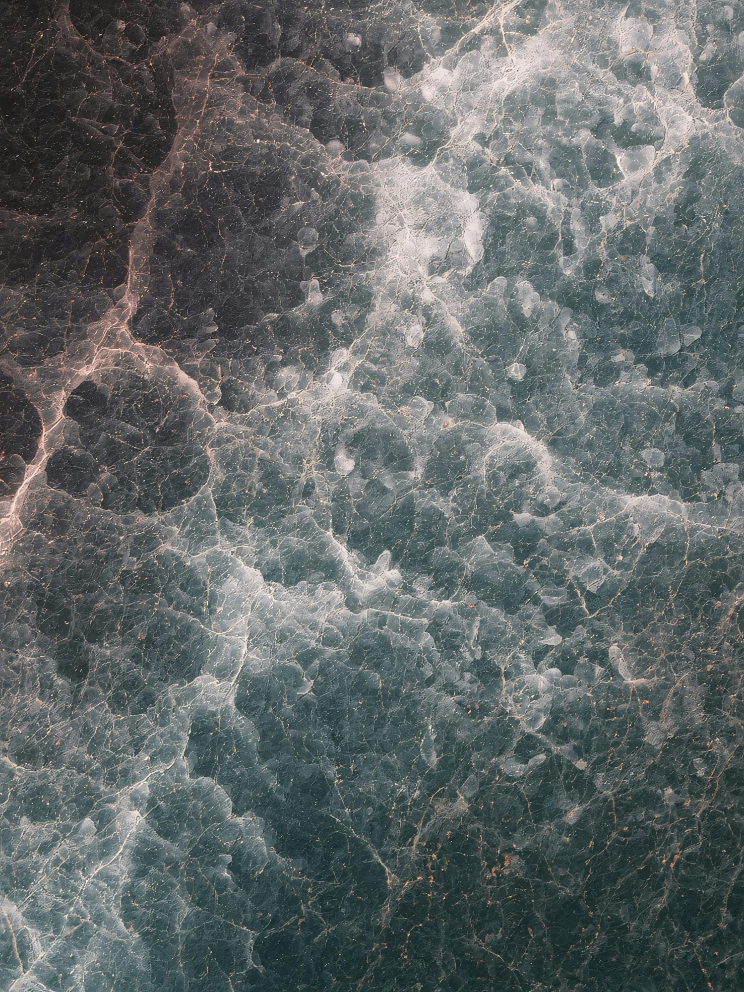 Abstract close-up of a textured surface resembling cracked ice, with intricate patterns and a mix of green and white hues.