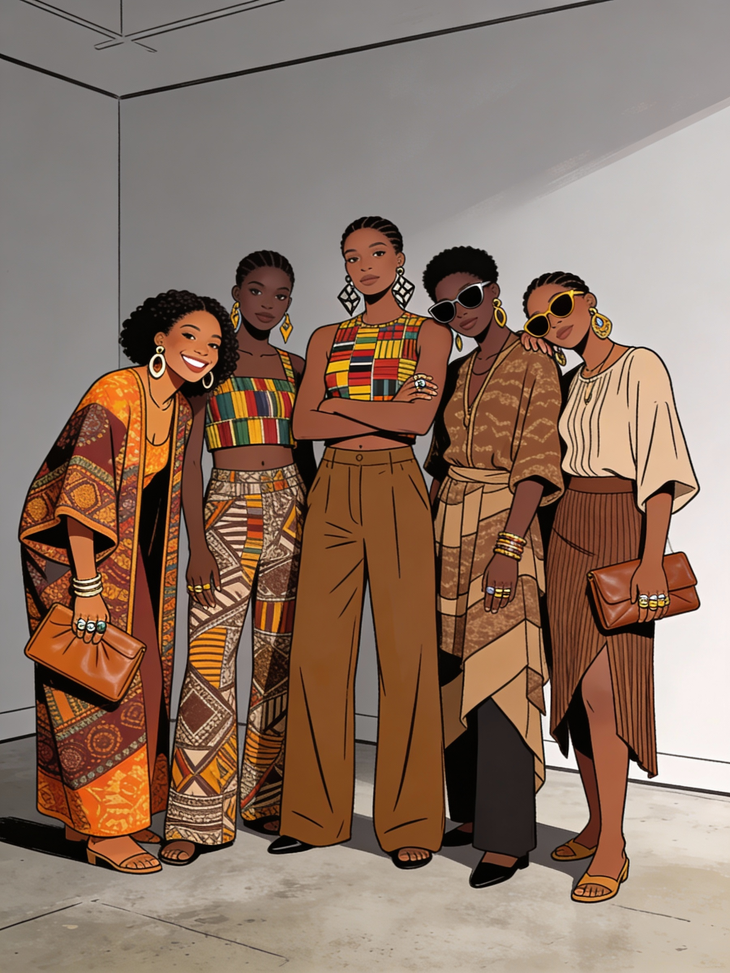 A stylish group in vibrant, patterned outfits with African-inspired designs, showcasing modern fashion and cultural heritage.