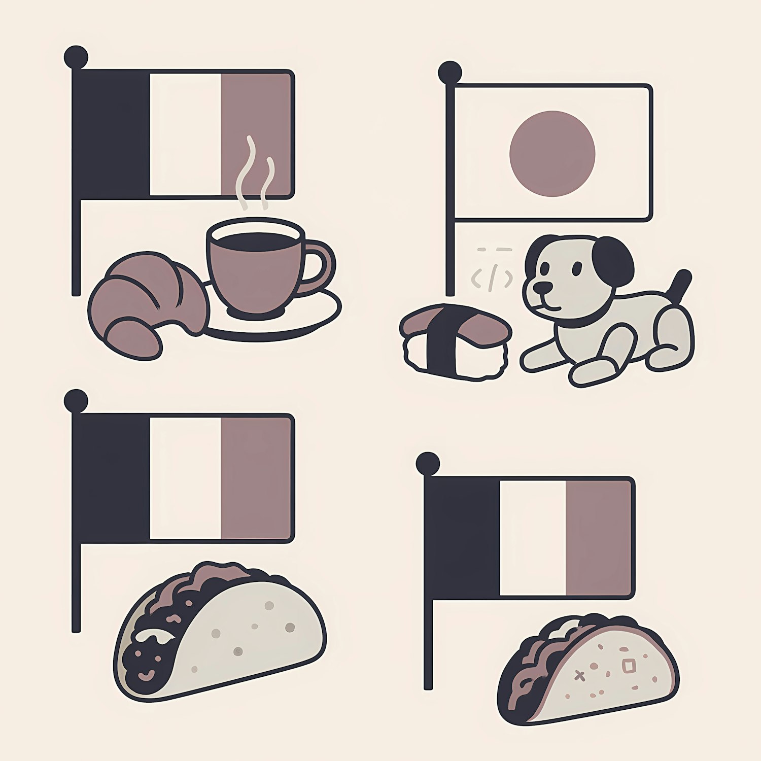 Minimalist illustration of flags with cultural items: French croissant, Japanese sushi, Mexican taco, and a playful mix of French flag with taco.