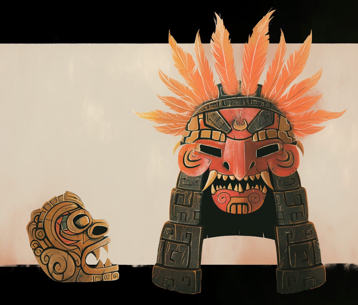 Intricate masks with vibrant colors and cultural motifs, featuring bold designs and striking feather adornments.